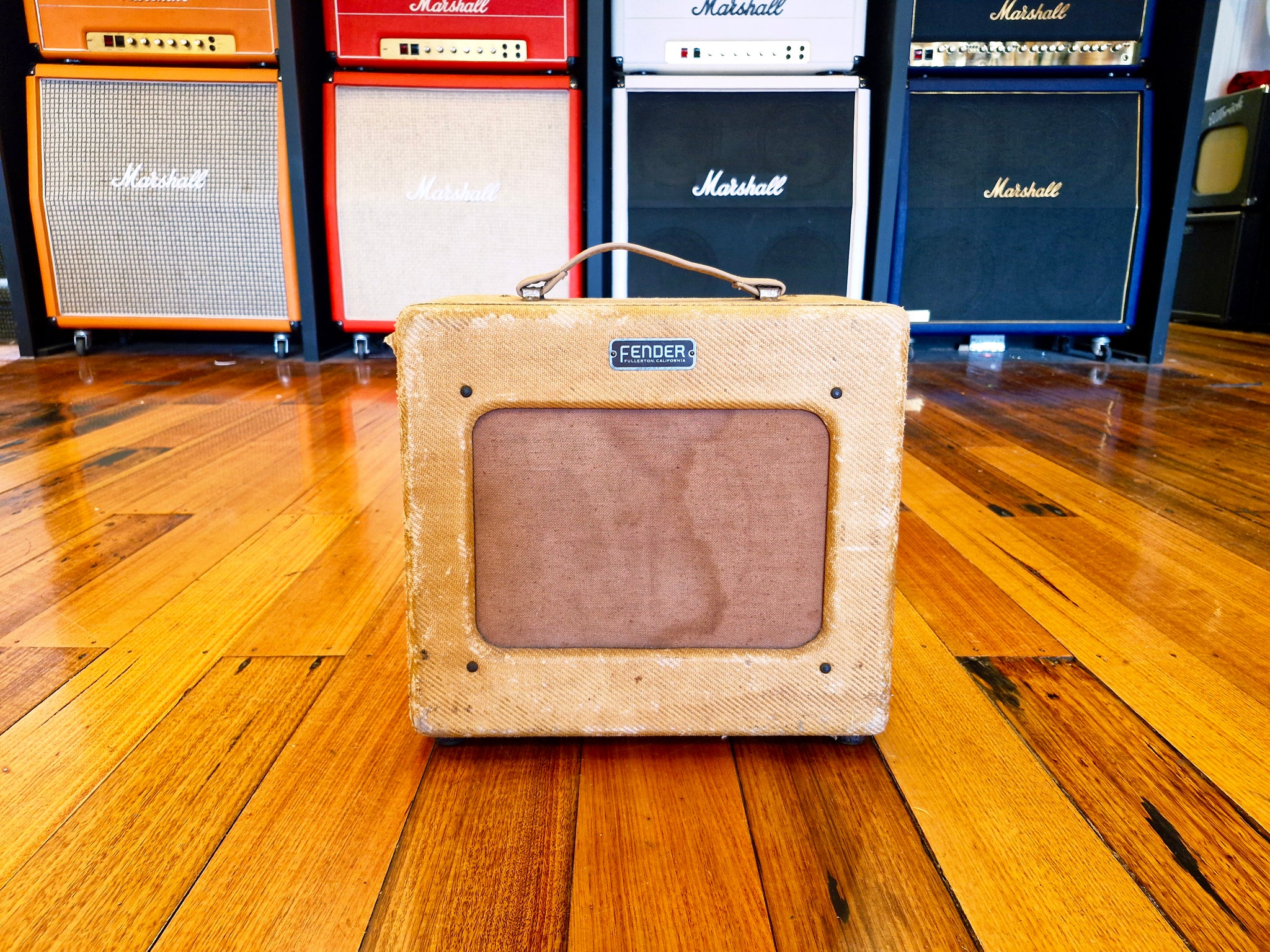 The 1948 Fender Princeton Tweed—often referred to as the 5A2 “TV Front”—is one of Fender’s earliest low-wattage combo amplifiers and a true cornerstone of the tweed era. Designed originally as a student amp, these little Princetons deliver around 4–5 watts of glorious Class A tone, driven by a single 6V6 power tube and 6SL7 / 6SC7 preamp valves.