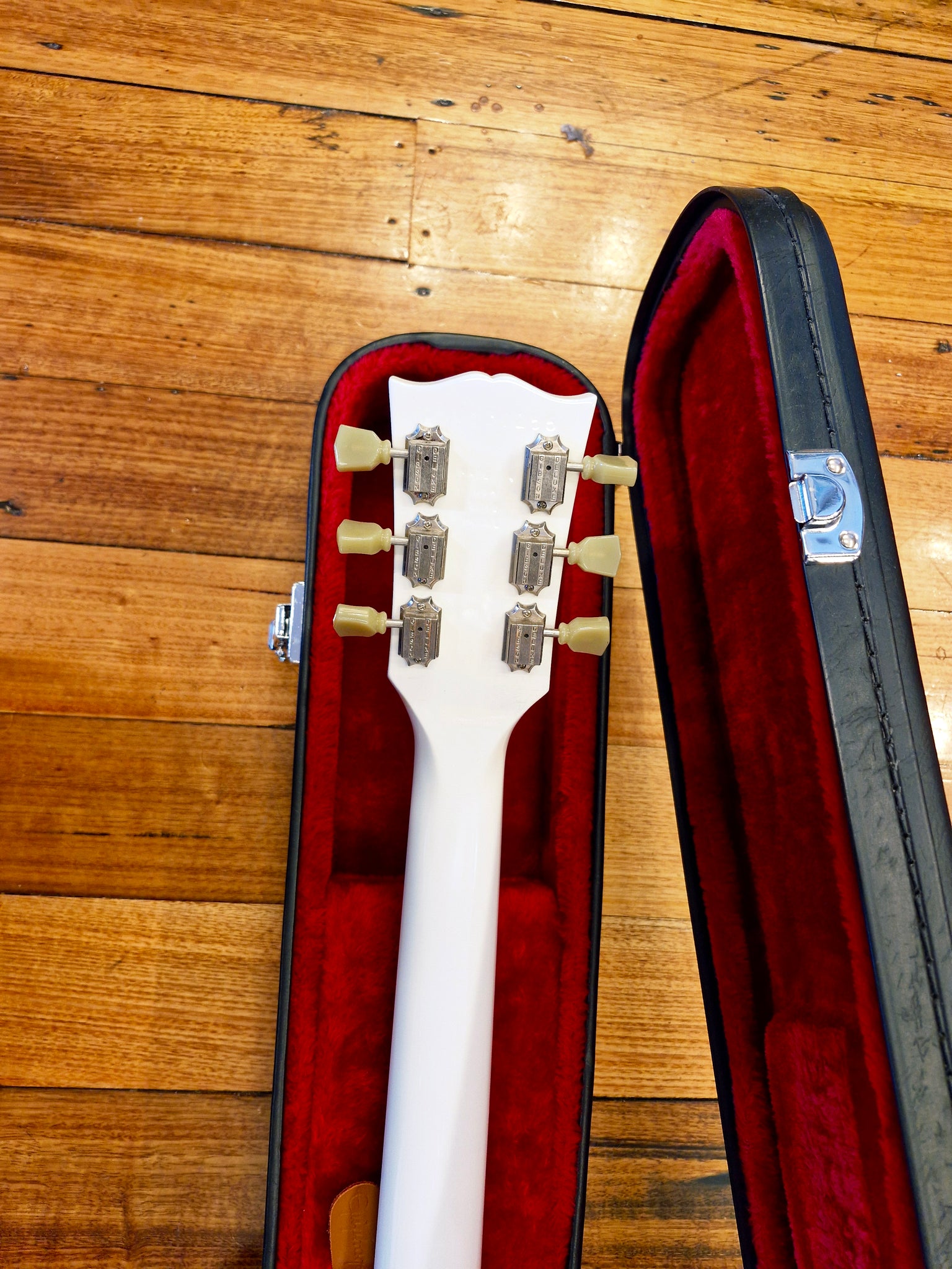 This 2016 Gibson Les Paul Studio in Alpine White presents an exceptional instrument in pristine condition. Featuring a classic solid body construction with a resonant maple top and mahogany back, it delivers a warm and sustained tones. The mahogany neck paired with a rosewood fretboard provides both durability and responsive playability across its 22 frets. With its 6-string configuration and meticulous craftsmanship, this guitar exhibits virtually no signs of wear, making it an outstanding choice suited for musicians who seek the authentic Gibson sound and craftsmanship without sacrificing quality or character.