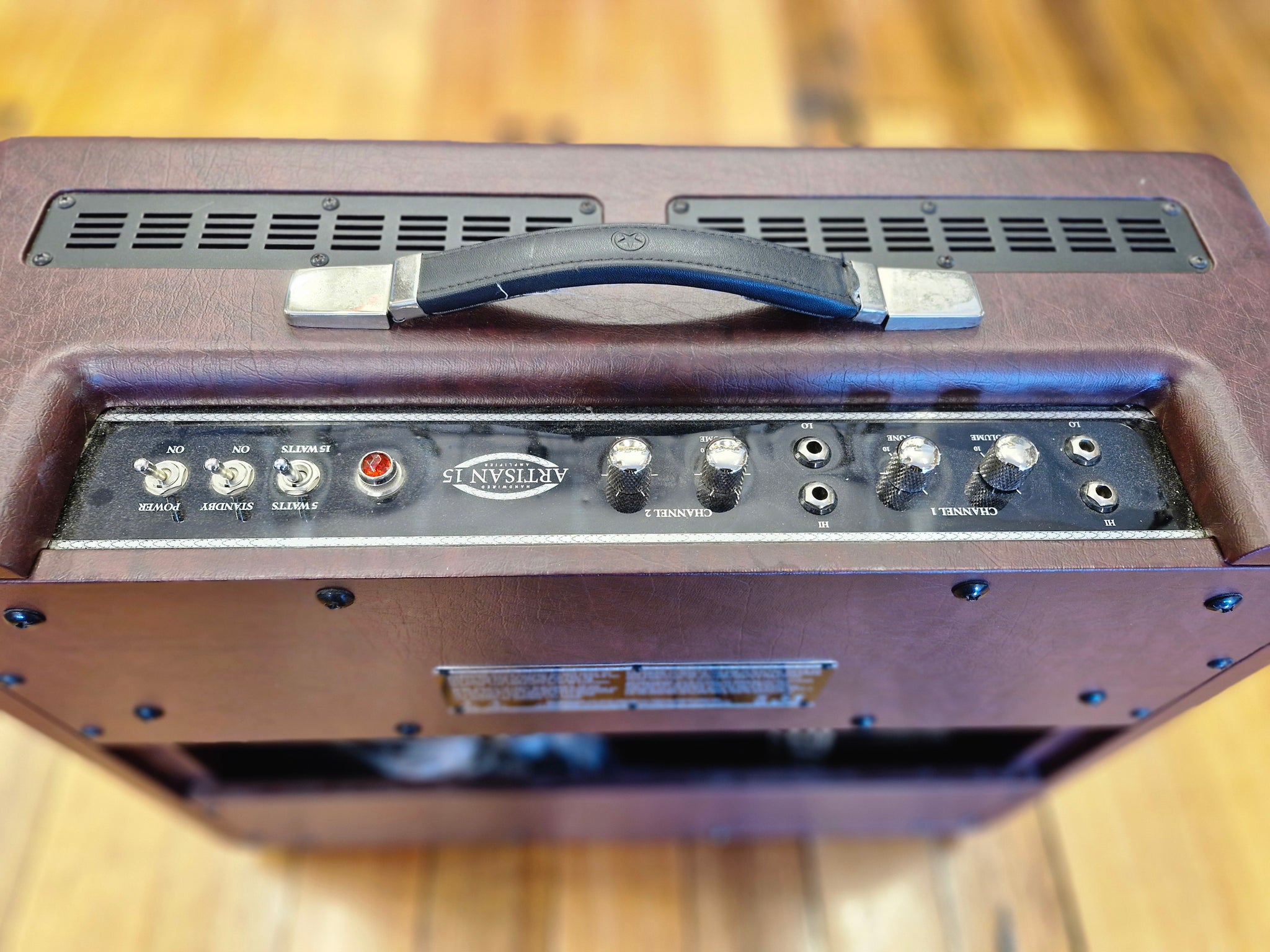 The Artisan 15 delivers exceptional aesthetics paired with refined sound quality. It features two distinct channels—one utilizing an EF86 Pentode and the other an ECC83 Triode—to capture classic vintage and boutique amplifier tones. The EL84 power section offers switchable output between 5W triode mode and 15W pentode mode, providing versatile low-power valve amplifier performance. Key features include a Class A 15W combo, selectable 5W/15W output, dual EL84 power valves, EF86 and ECC83 channels, Hi and Lo inputs ideal for channel blending, and an impedance selector for optimal matching.