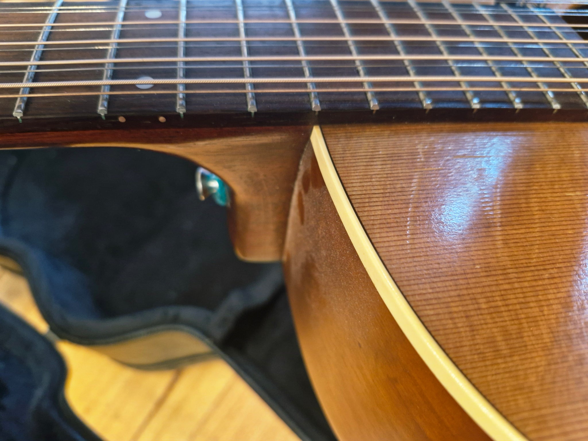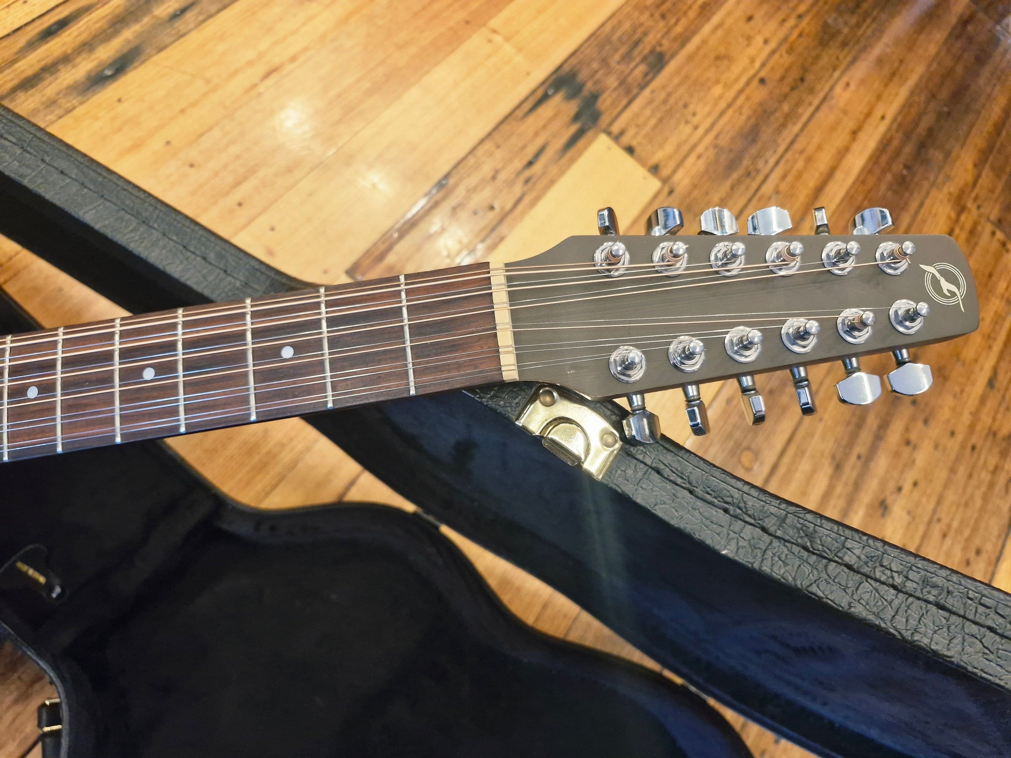 The Coastline S12+ Cedar features minor wear, including a small chip on the back of the neck and several dents on the body. Renowned for its tuning ease, this 12-string guitar benefits from Seagull’s neck design, providing exceptional stability to withstand the added tension typical of twelve strings. Its tapered headstock ensures a straight string pull, significantly improving tuning accuracy and retention. The guitar is sold with the case shown in the photo.