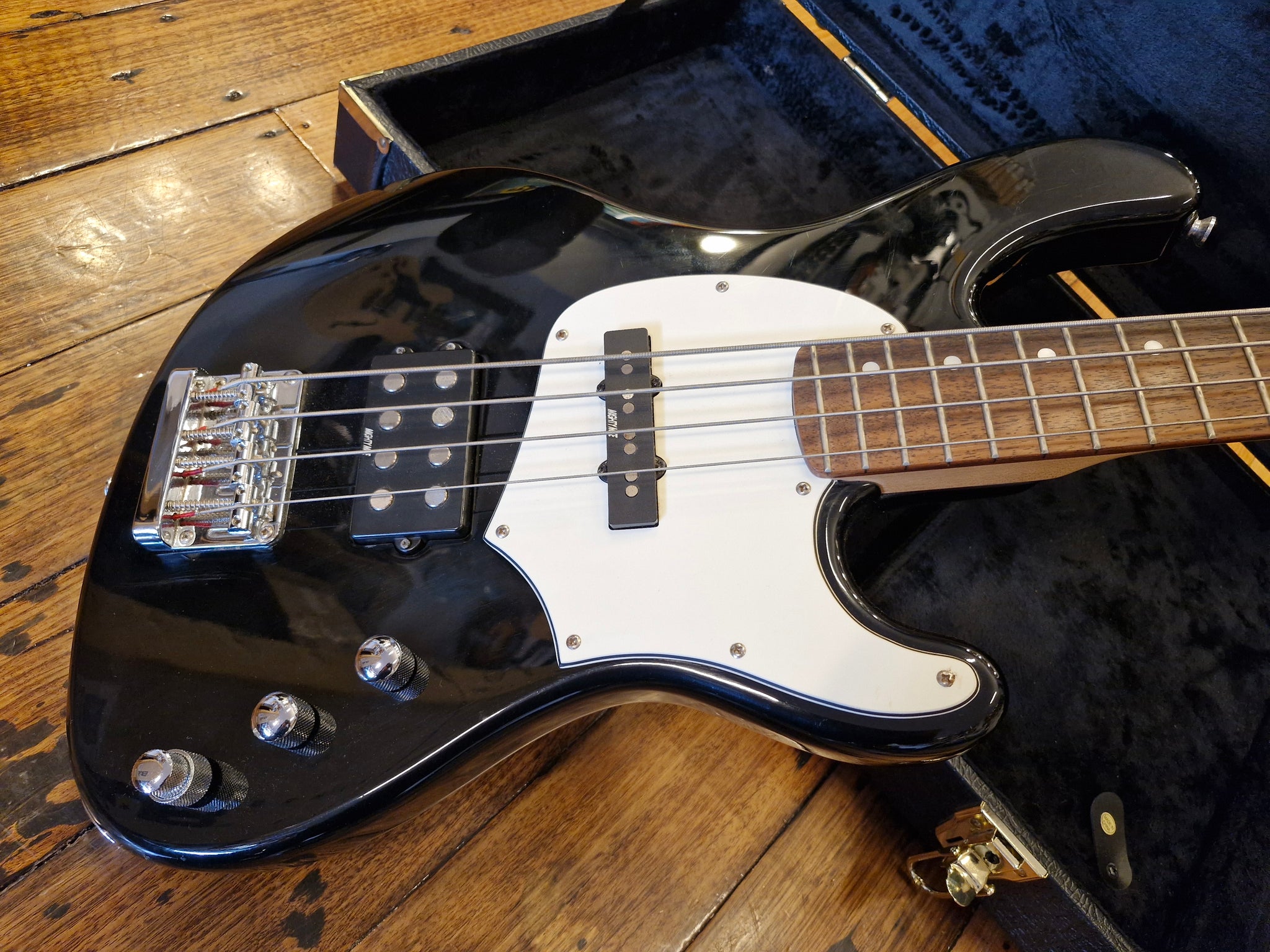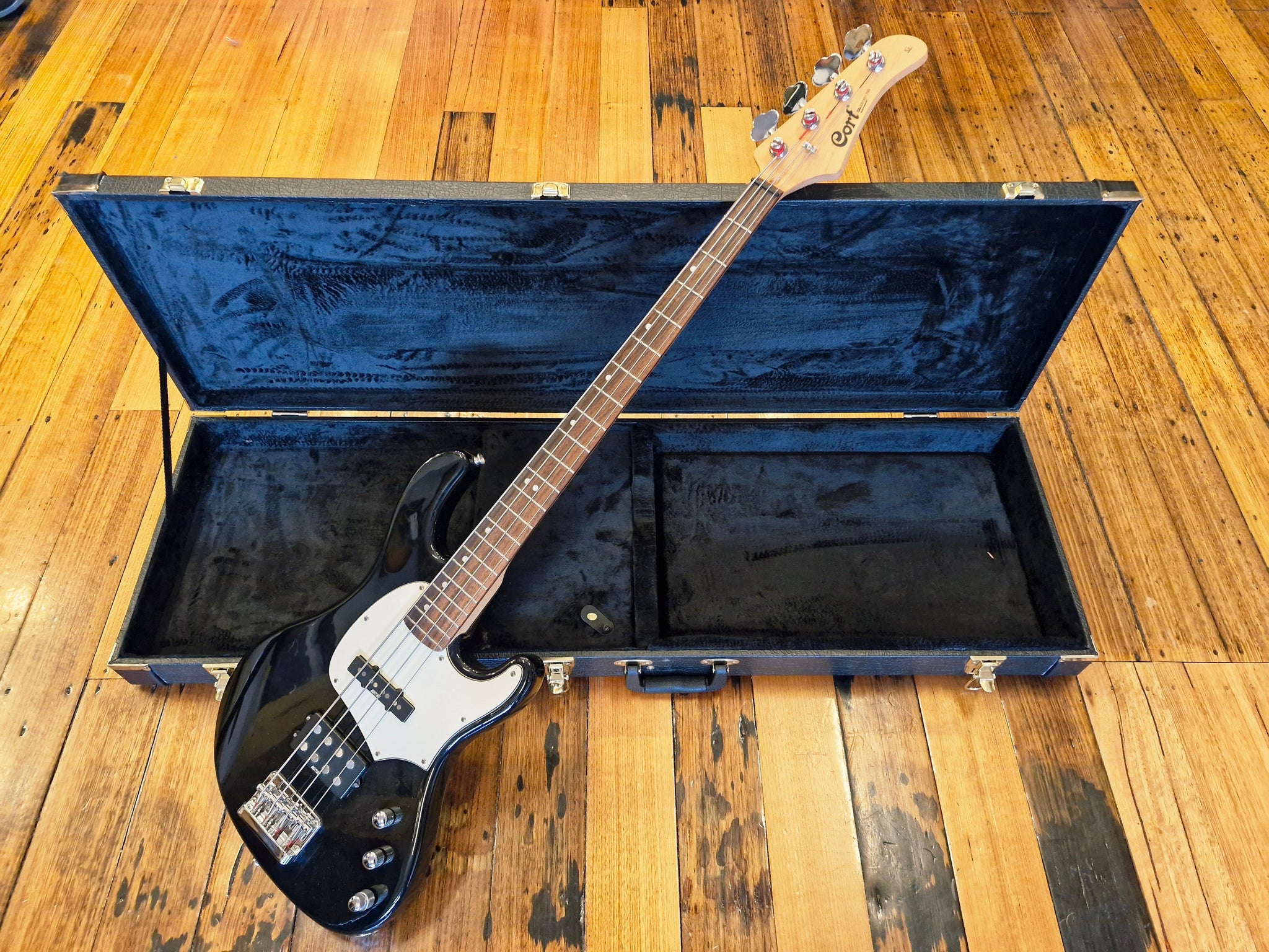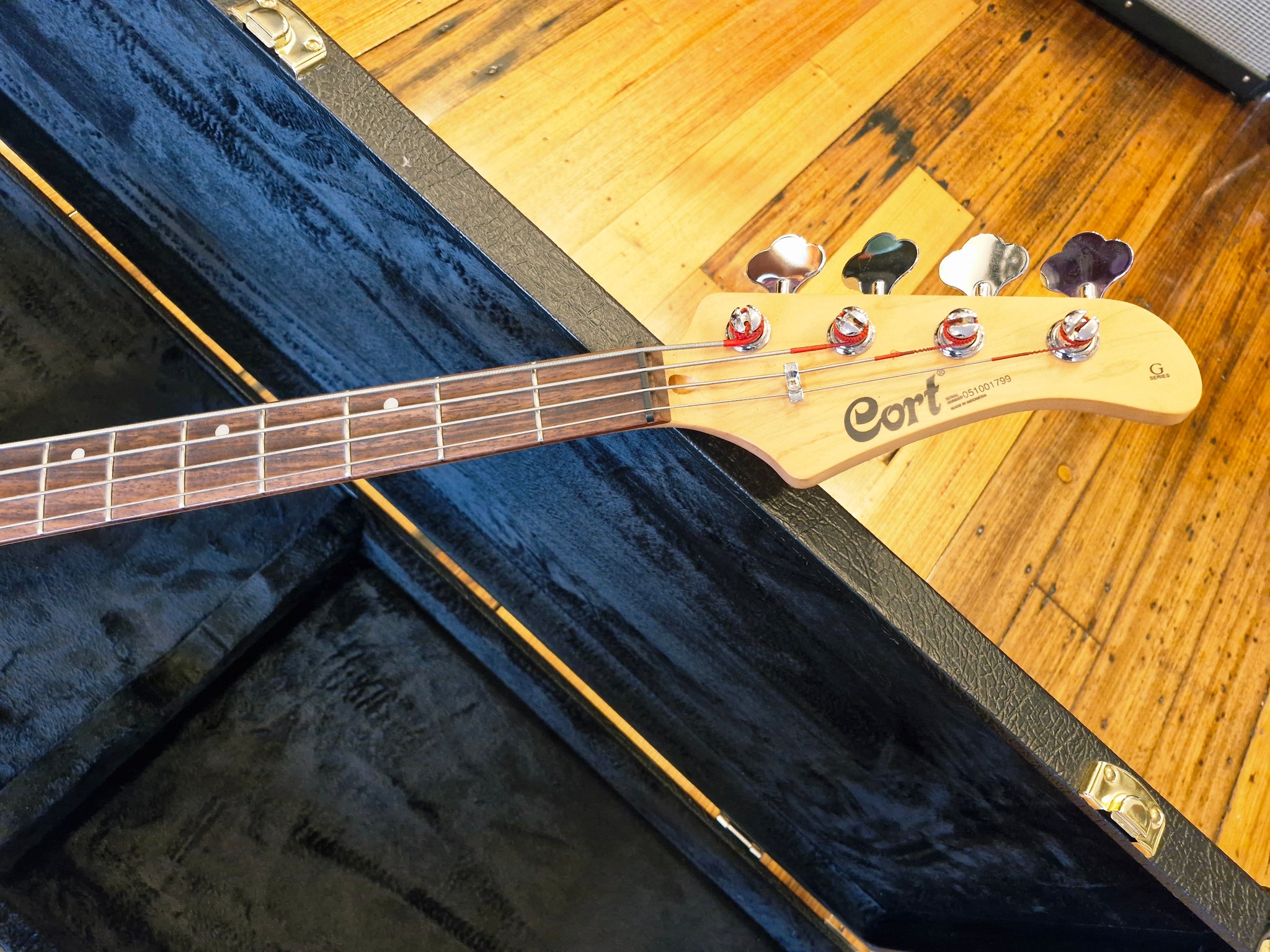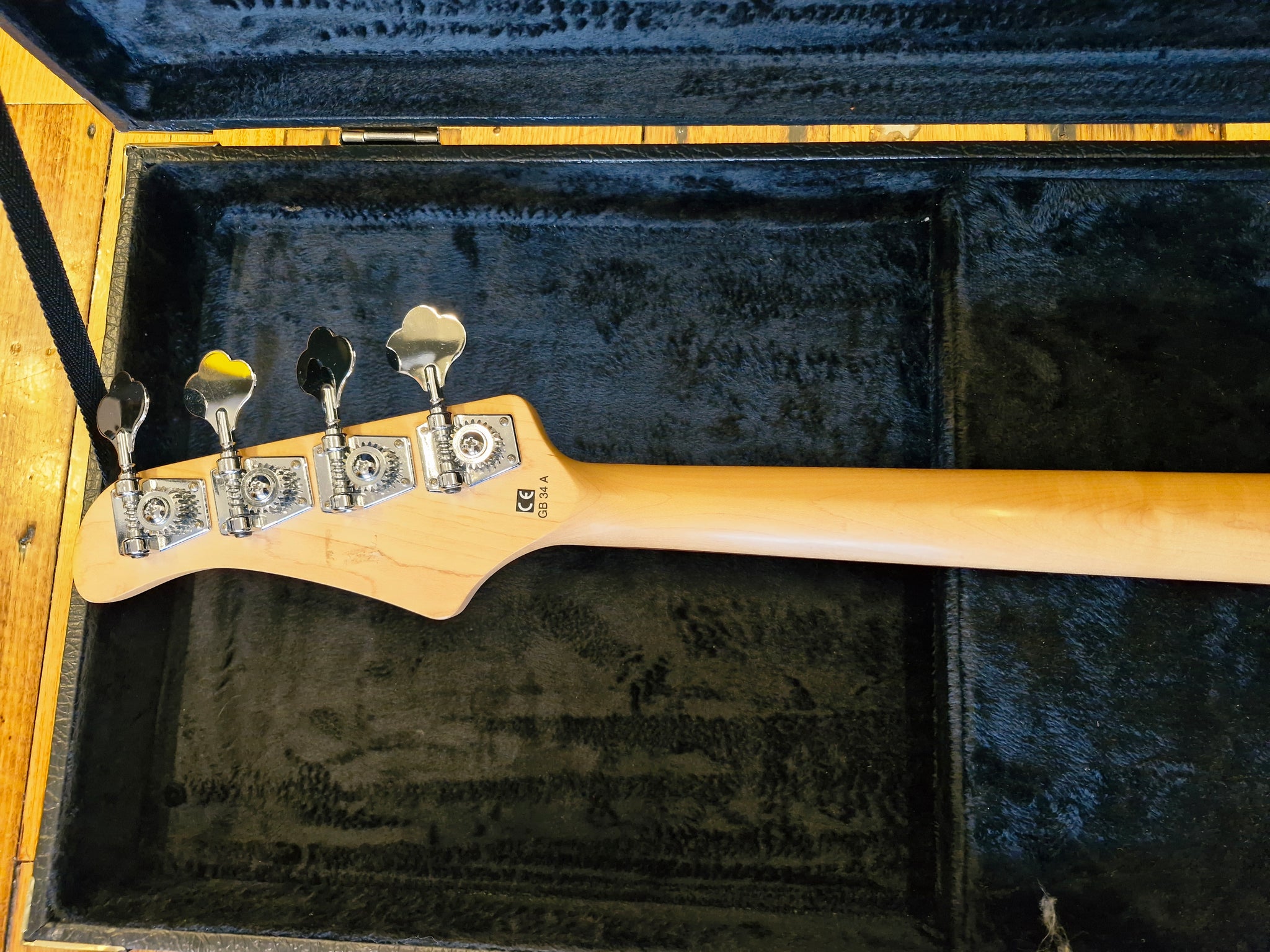 This bass features barely visible scratches and delivers exceptional playability with its lightweight design, making it comfortable for standing performance. The Cort GB34A blends a traditional aesthetic and tone with modern functionality, equipped with Jazz-MM humbuckers and an active 2-band EQ that offers both active and passive modes via a push-pull volume control. Crafted with a poplar body, Canadian hard maple neck, and rosewood fingerboard, it provides a 34" scale and reliable hardware for professional use. This combination ensures versatile sound and enhanced performance for discerning bassists. Comes with a gig bag.