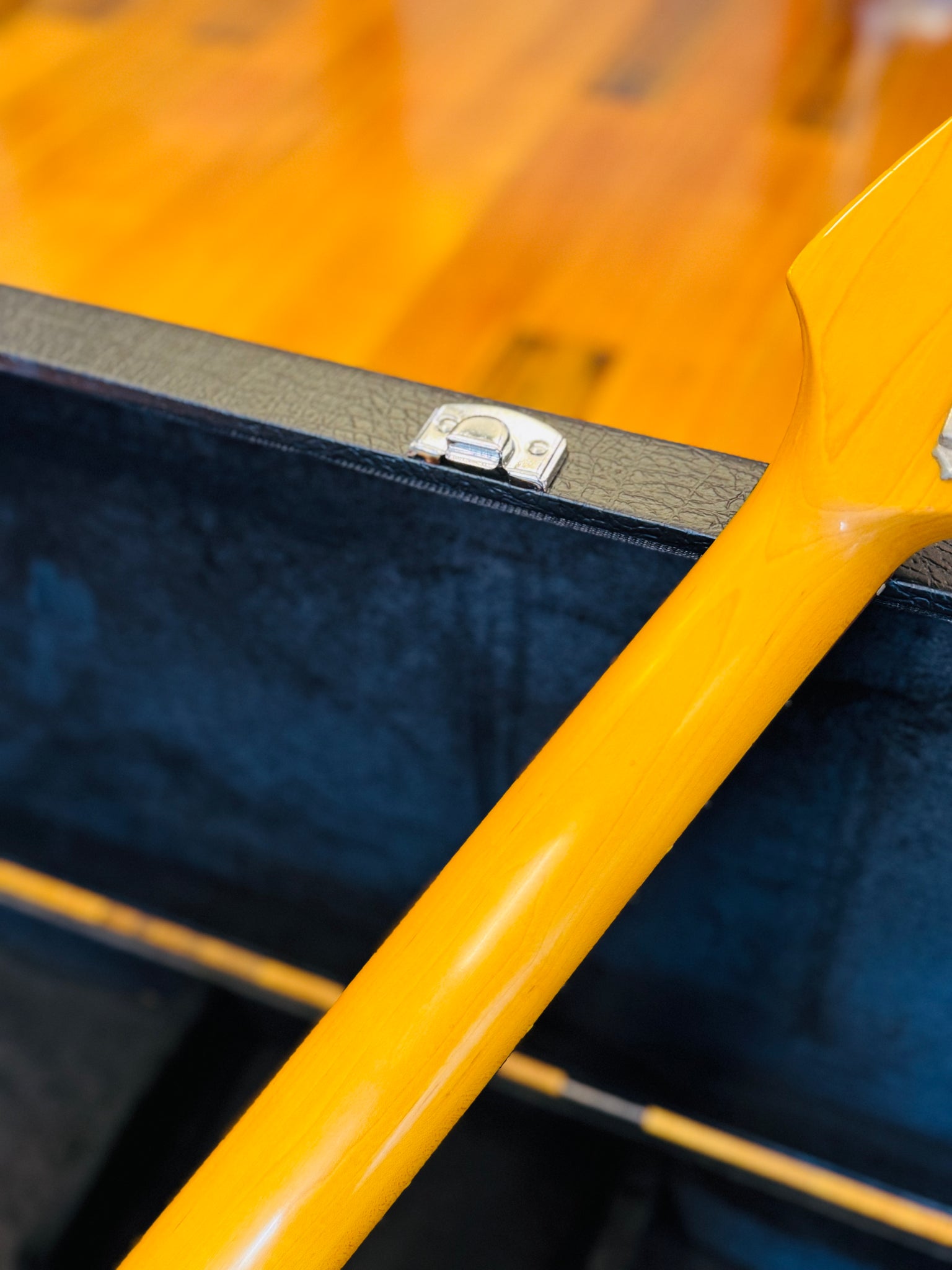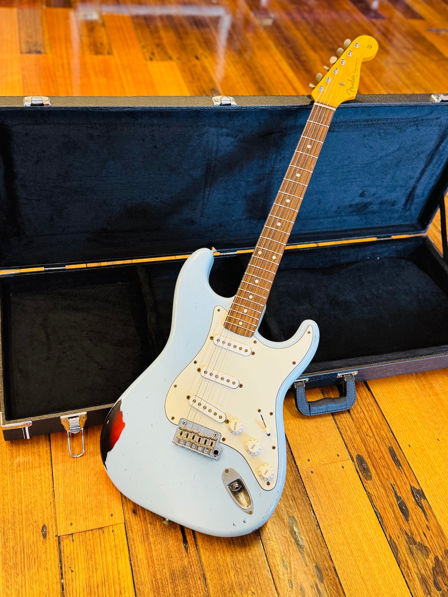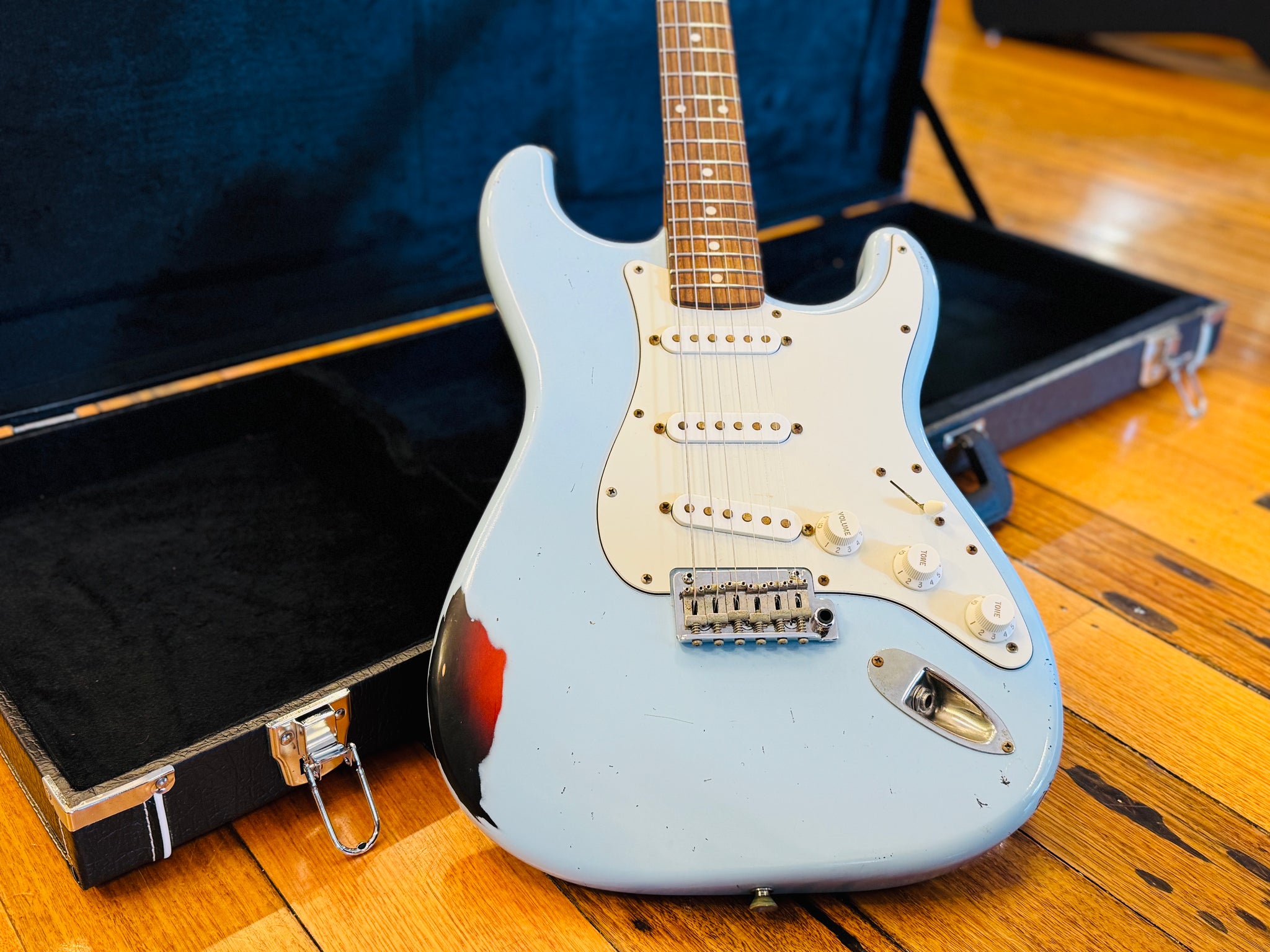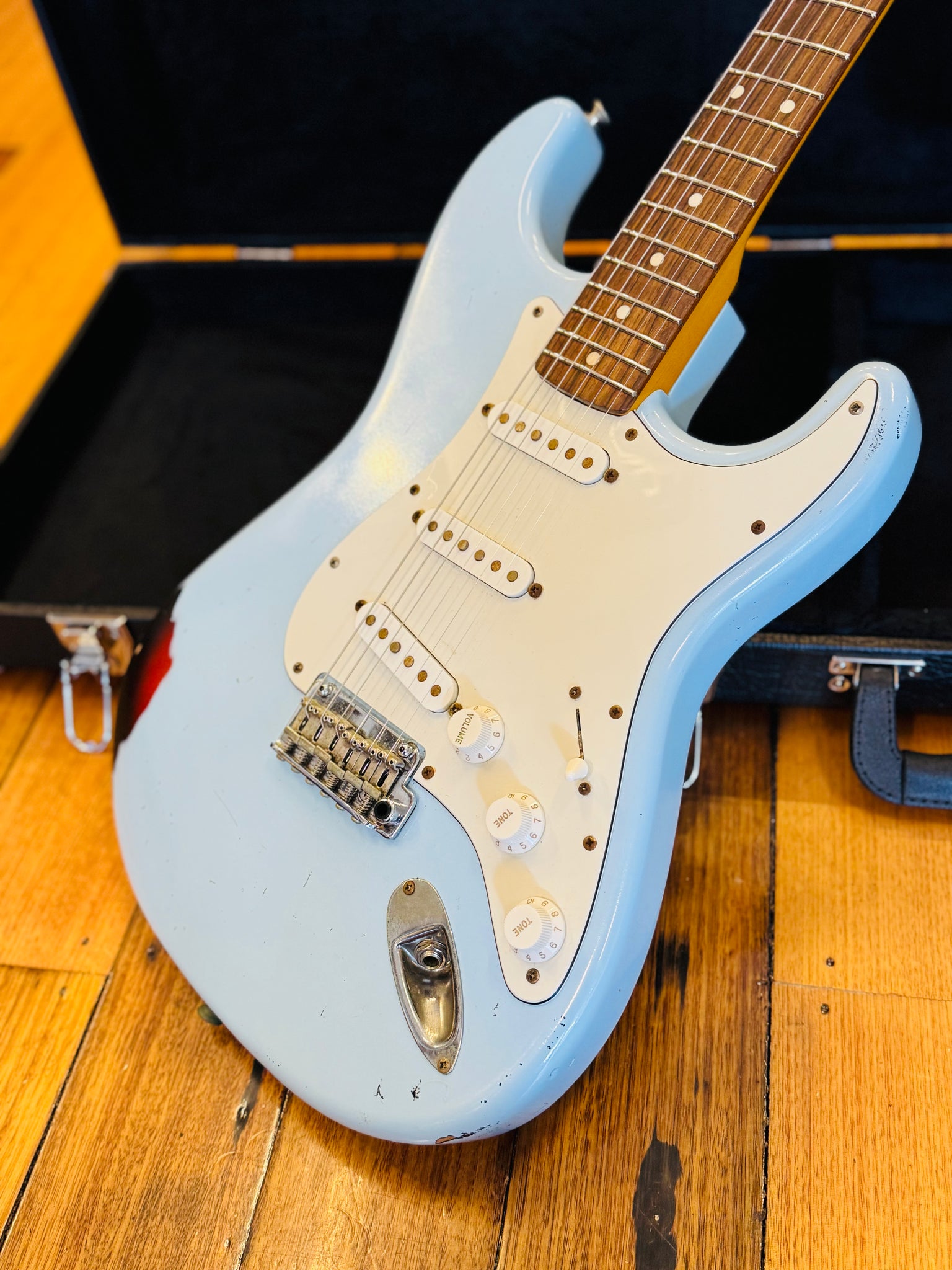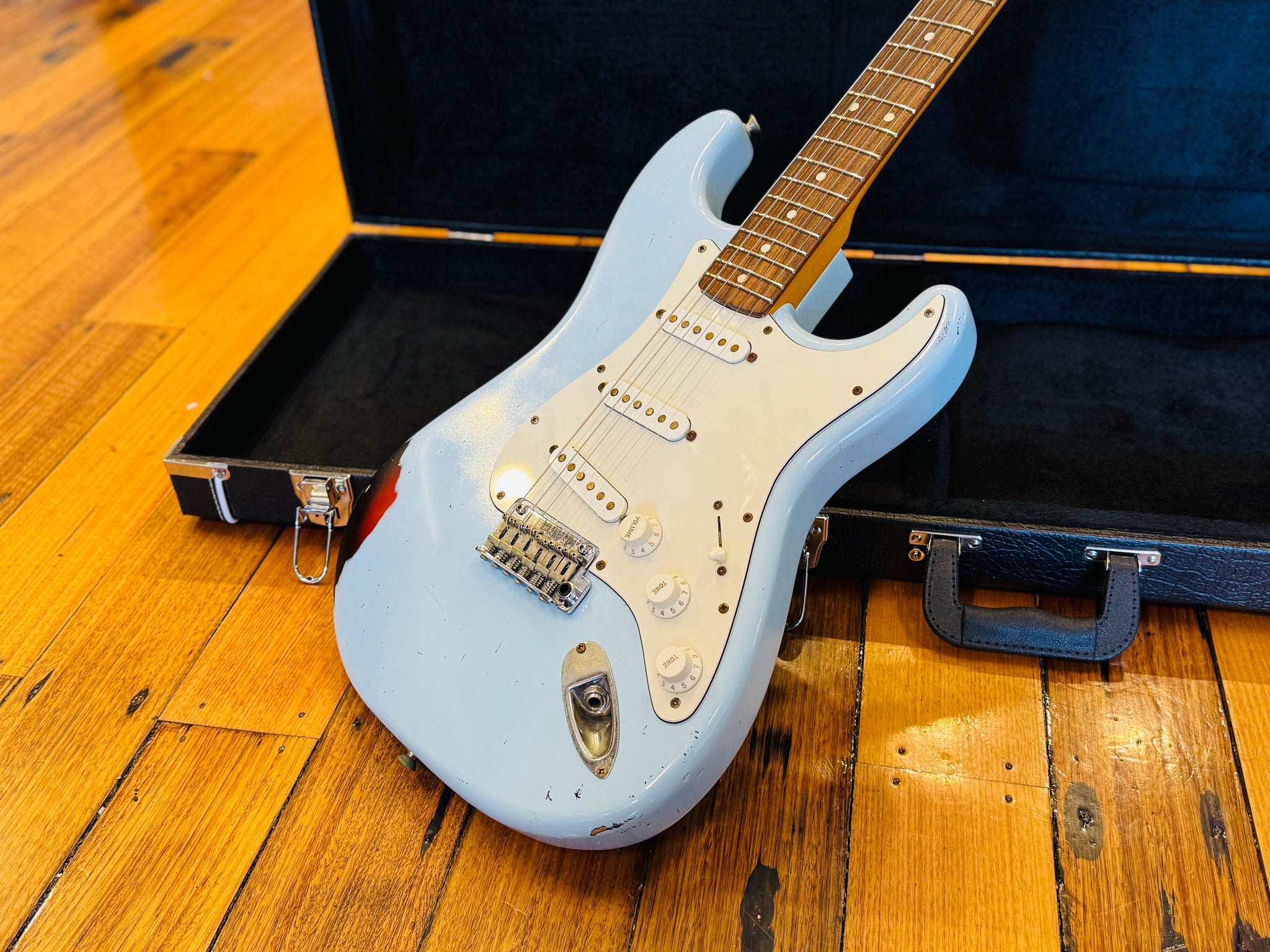 This custom-built Fender-style Partscaster brings together a mix of high-quality components and genuine vintage character. It features a Fender Japan neck paired with what appears to be a modified Fender body, originally finished in Sunburst and later refinished in Daphne Blue for that classic worn-in vibe.