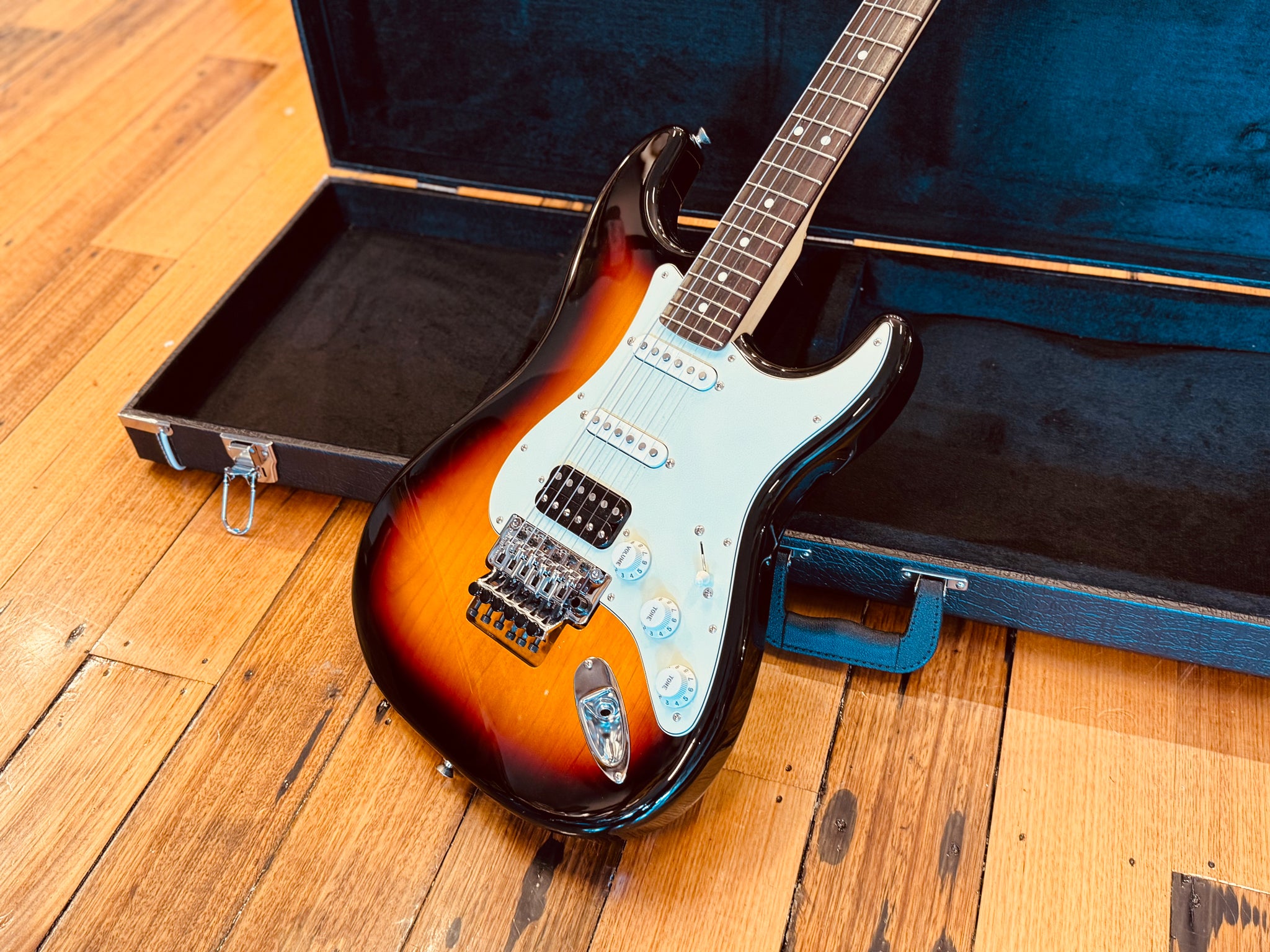 This Japanese-made Fender Stratocaster (JD-series, 2021) is a classic with attitude — a true Strat with a twist. At first glance it looks like a traditional Sunburst Stratocaster, but a closer look reveals a factory-fitted Floyd Rose tremolo and Humbucker bridge pickup, giving it a bold modern edge. It’s the perfect mix of old-school Fender character meets new-school performance.