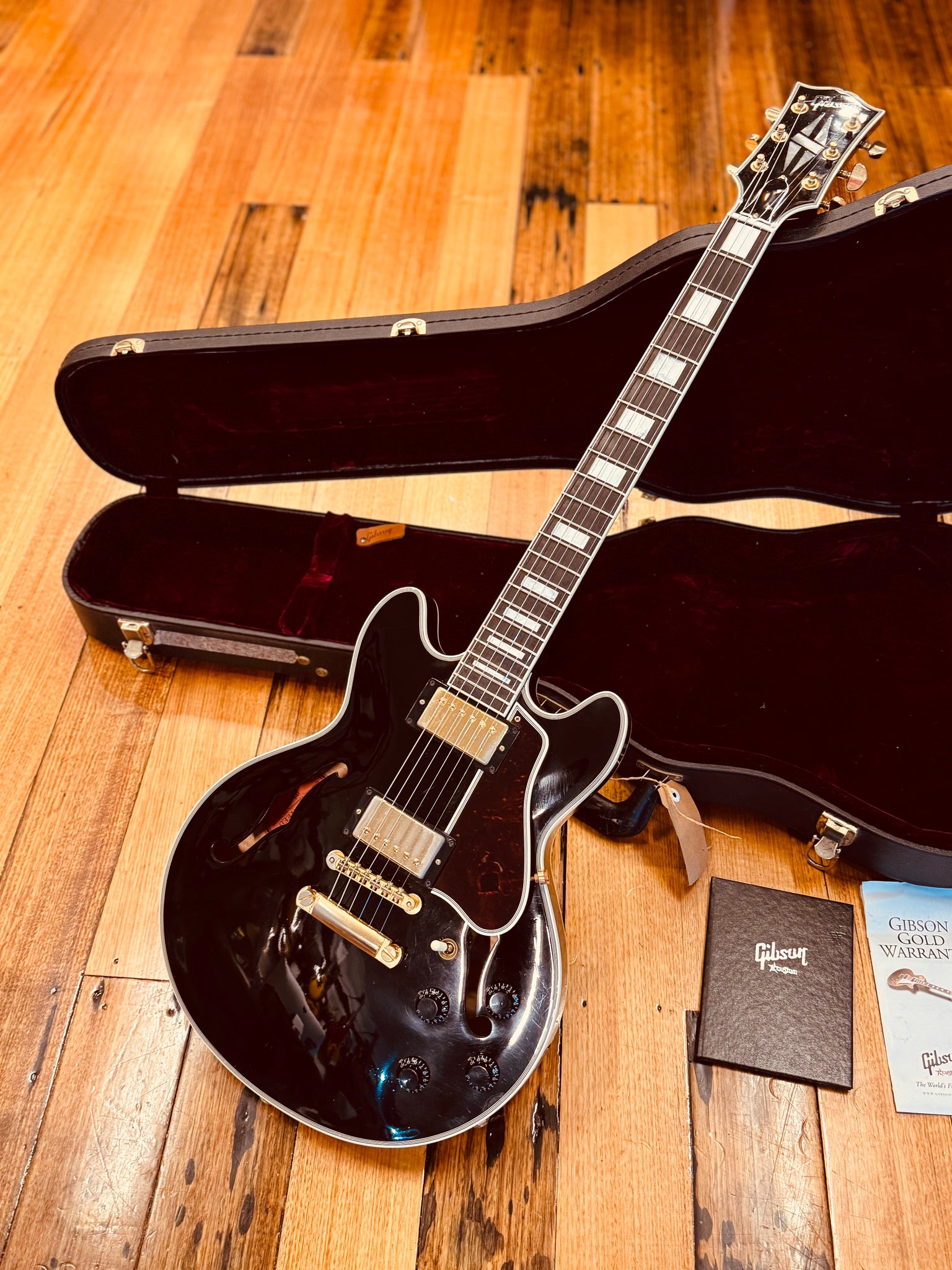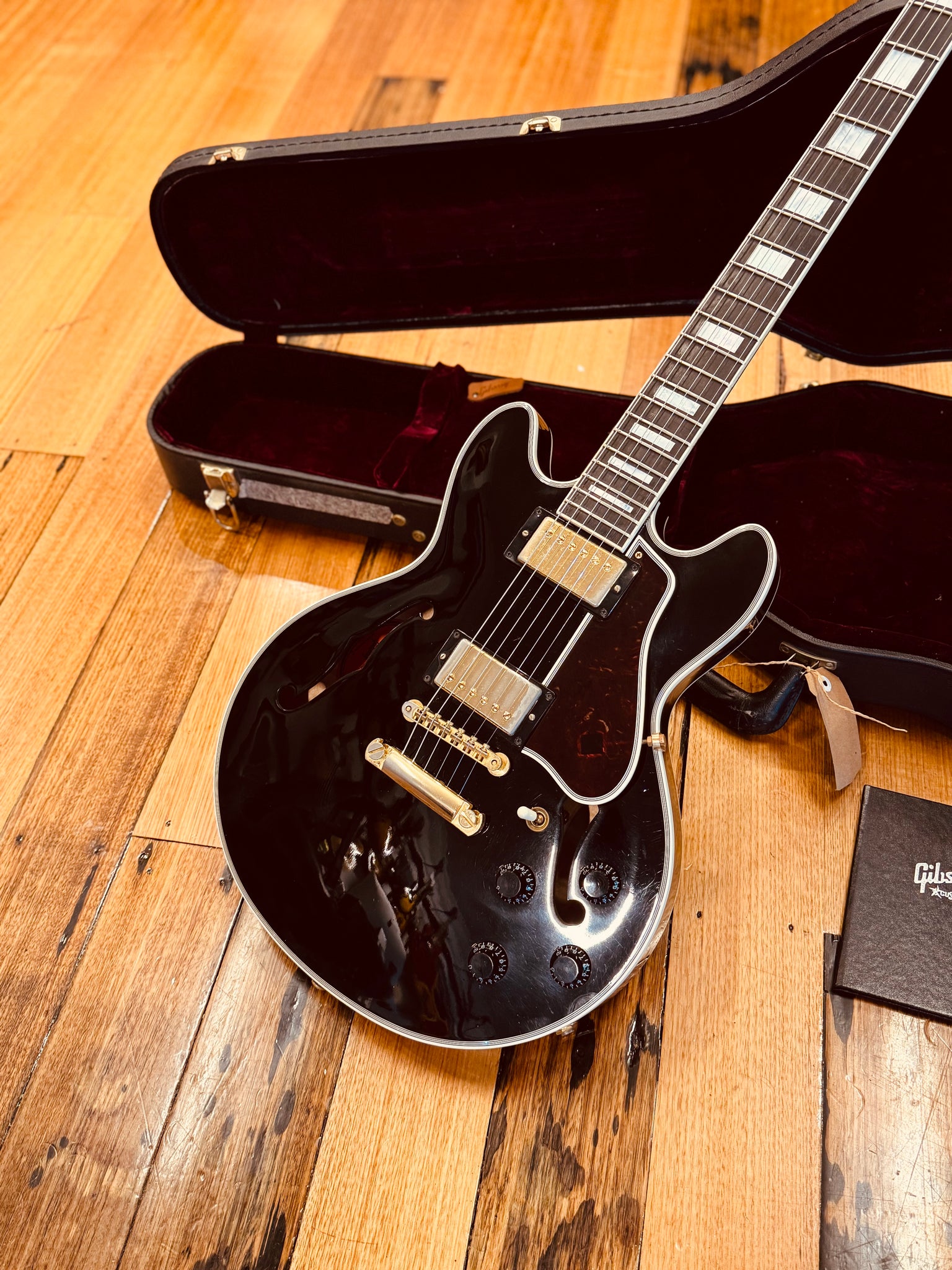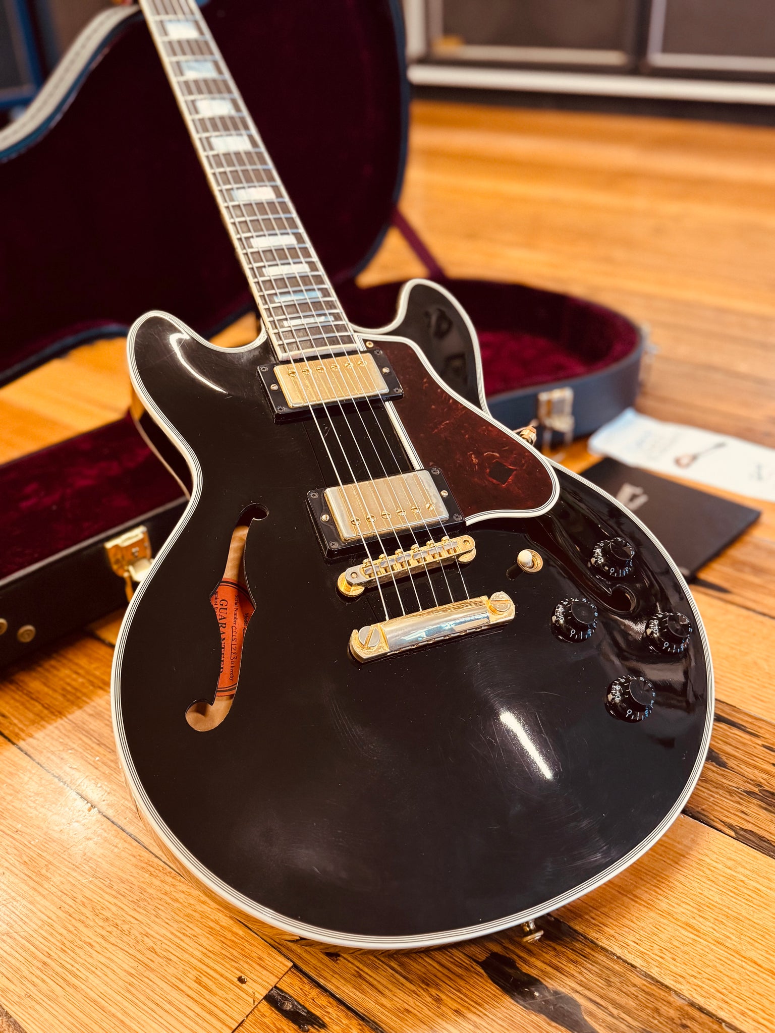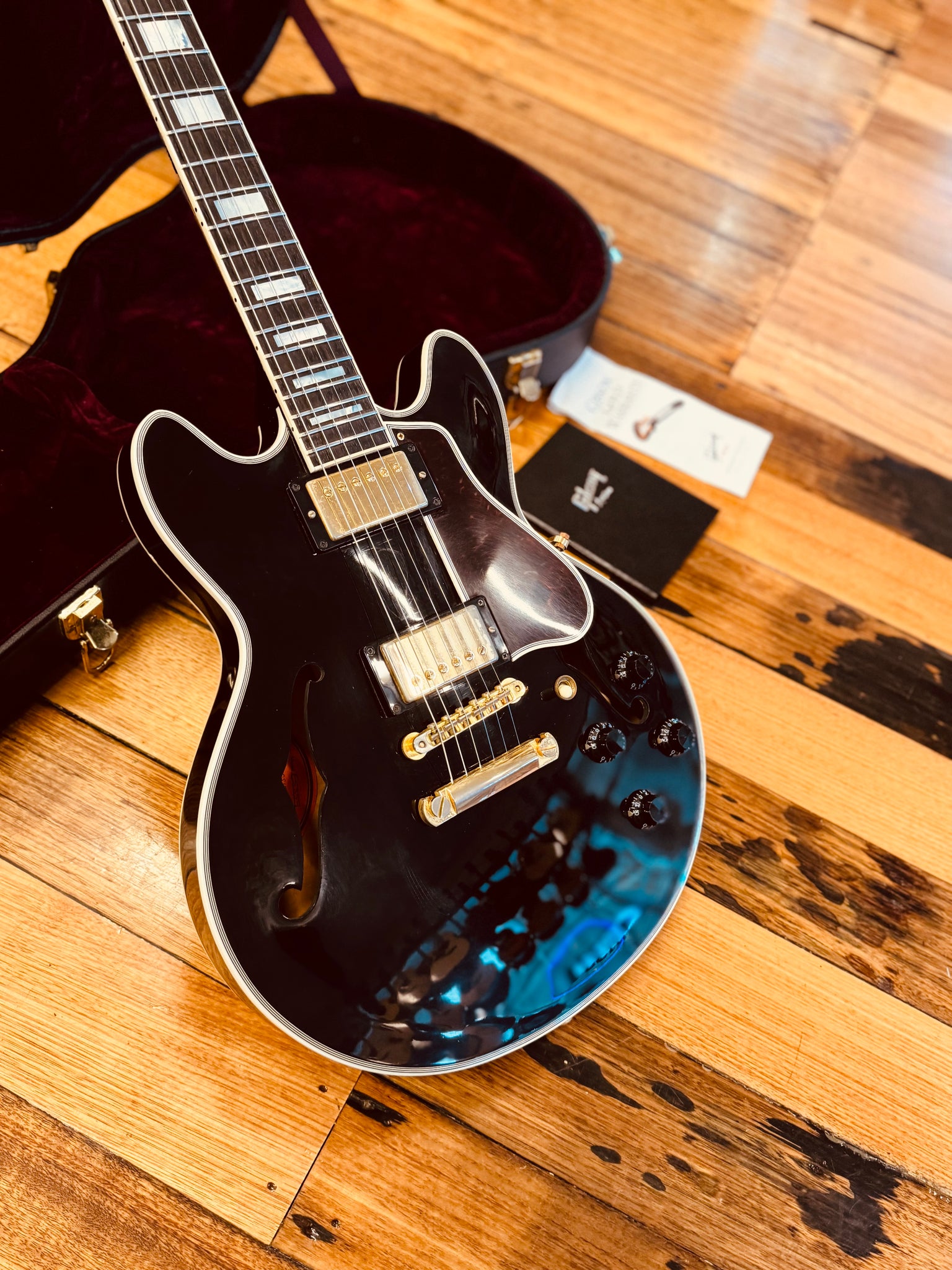 The Gibson ES-359 Custom Shop is a premium semi-hollow guitar that bridges the gap between compact comfort and full-bodied Gibson tone. Finished in a striking Ebony, this example is in great condition, showing only some minor playwear consistent with light use.