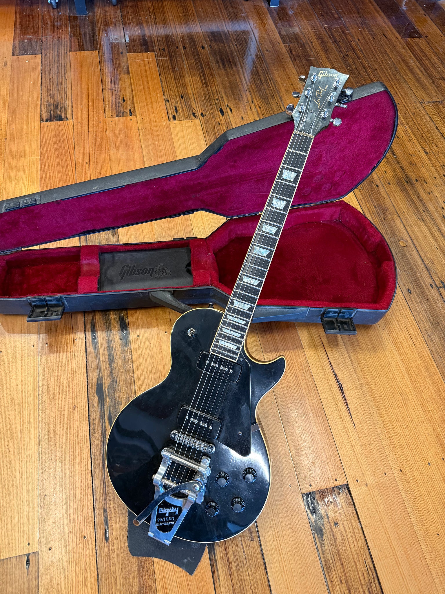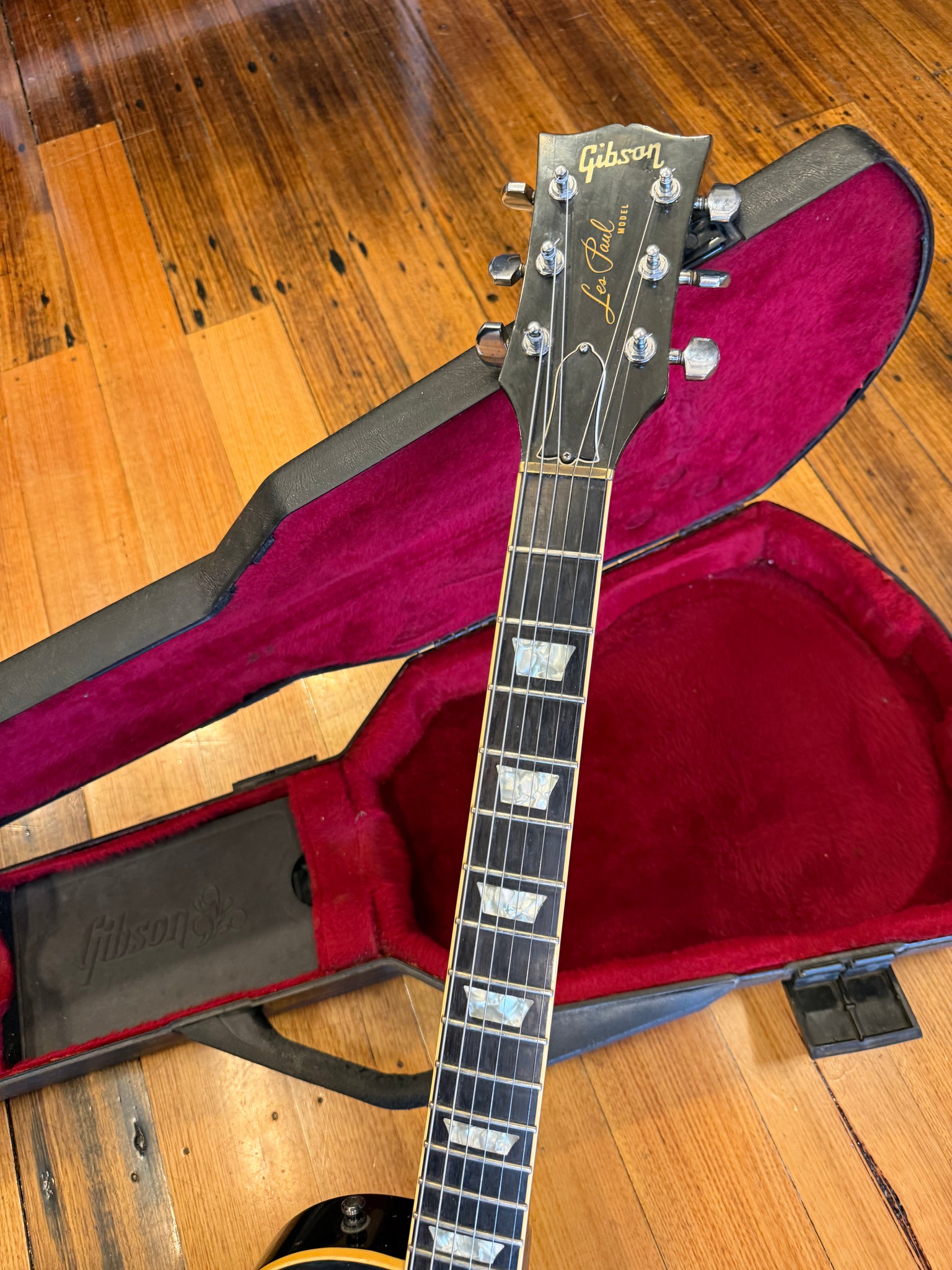 The guitar comes housed in a Gibson Protector case. One latch on the case is broken and the internal strap that normally stops the lid opening fully is missing, but the case still functions well for protection and transport.