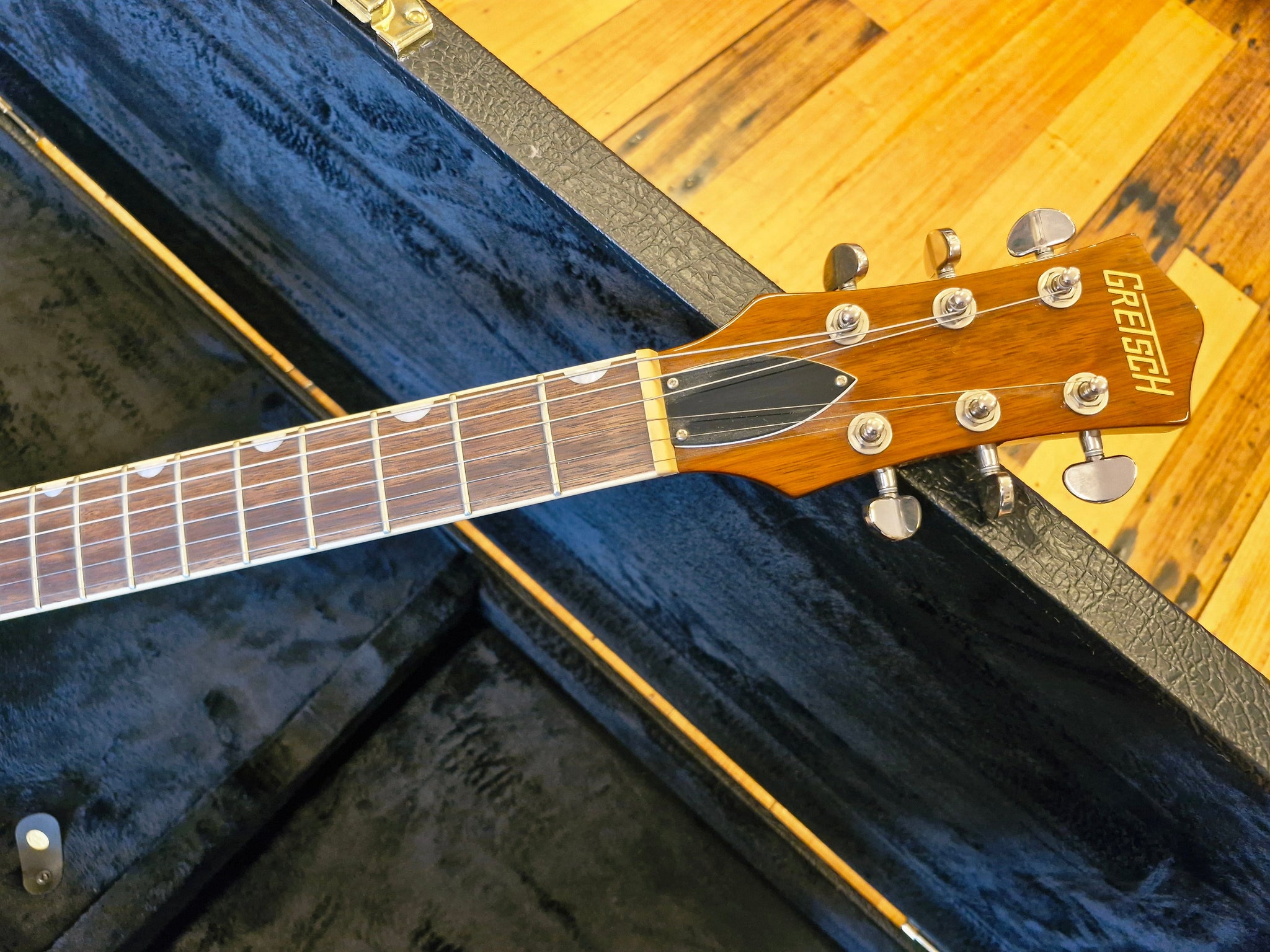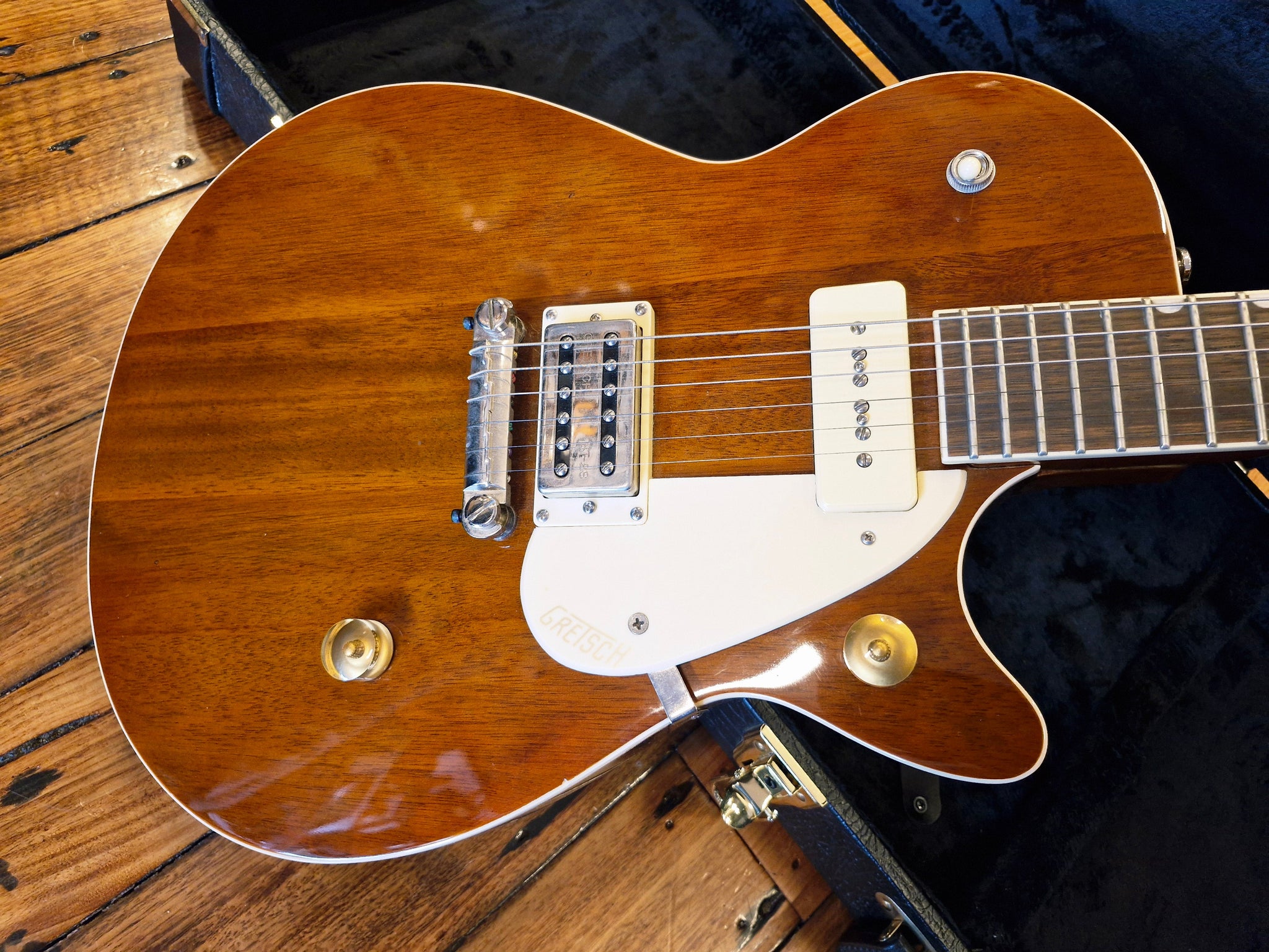 In excellent condition, this Gretsch G2215-P90 Streamliner Junior Jet Club is a striking guitar that plays smoothly. As an addition to the Streamliner Collection, it offers a robust and versatile sound powered by Broad'Tron BT-2S bridge and P90 Soap Bar neck pickups. This model produces tight lows and rich mids, refined by master volume and tone controls alongside a three-way pickup selector. The bound nato body features elegant new finishes, paired with a mahogany-stained nato neck and a 12"-radius laurel fingerboard adorned with pearloid Neo-Classic thumbnail inlays and 22 medium jumbo frets. Additional highlights include an anchored compensated wrap-around bridge, Electro-style knobs, aged white binding, and durable nickel hardware.