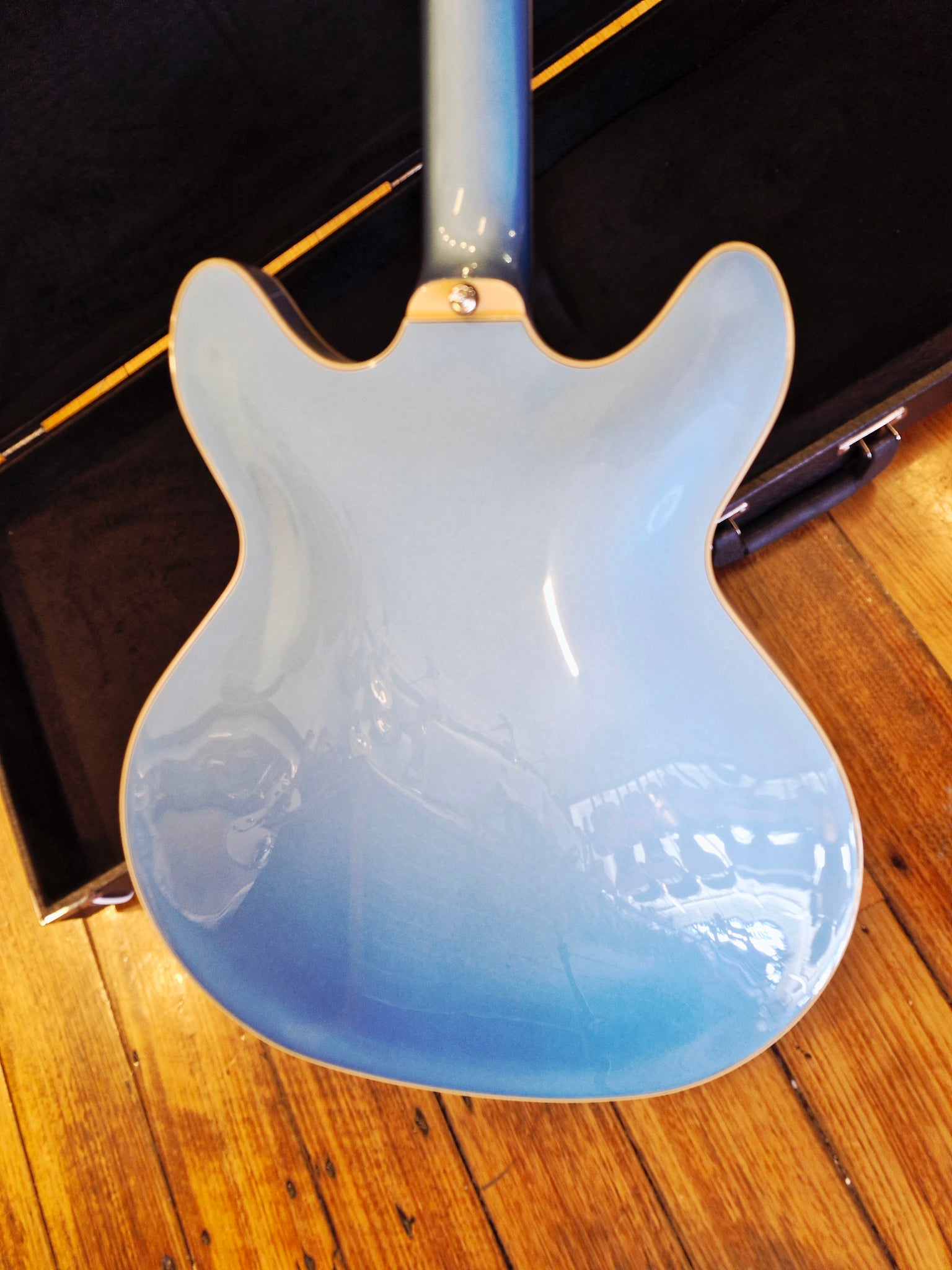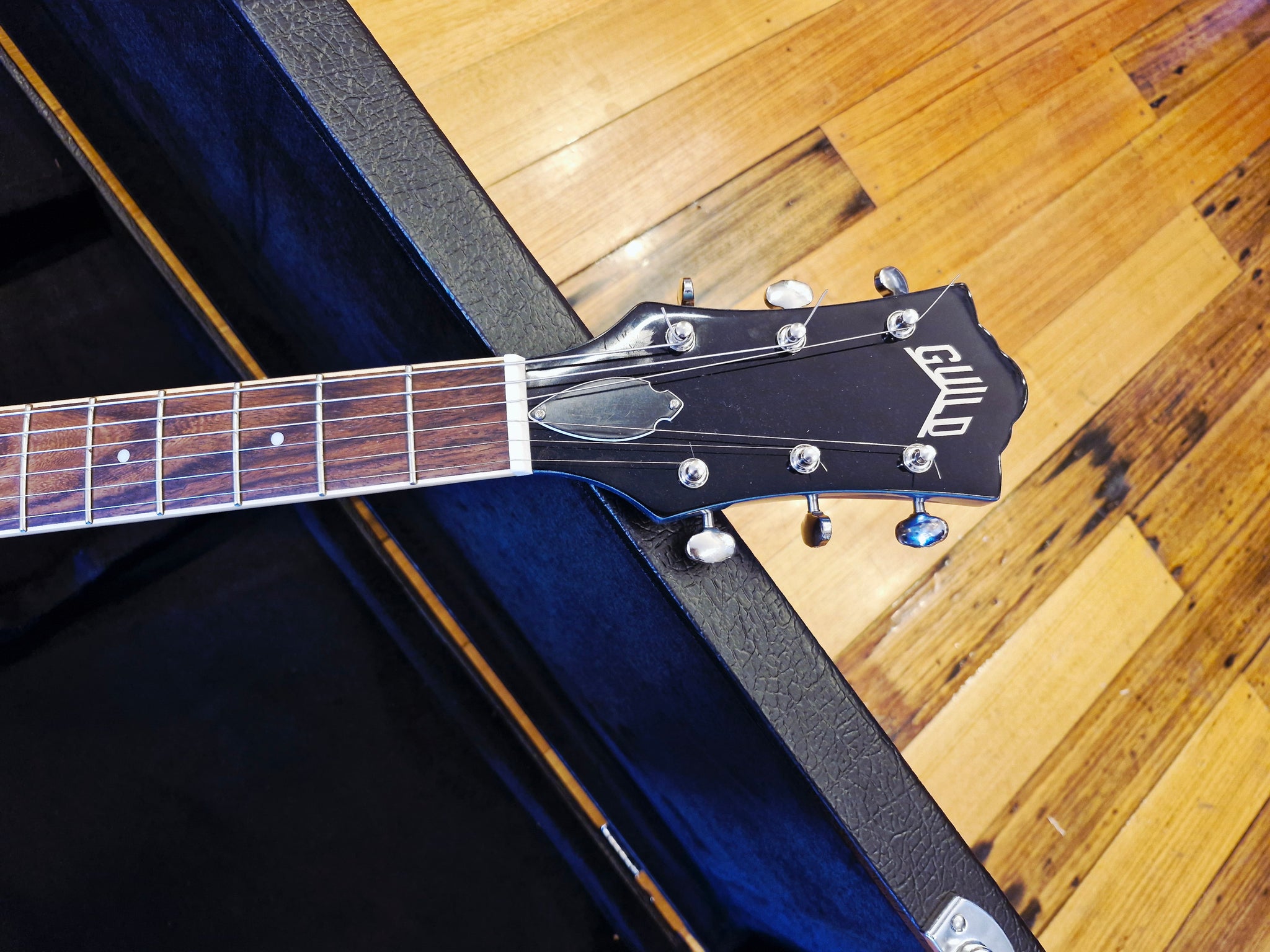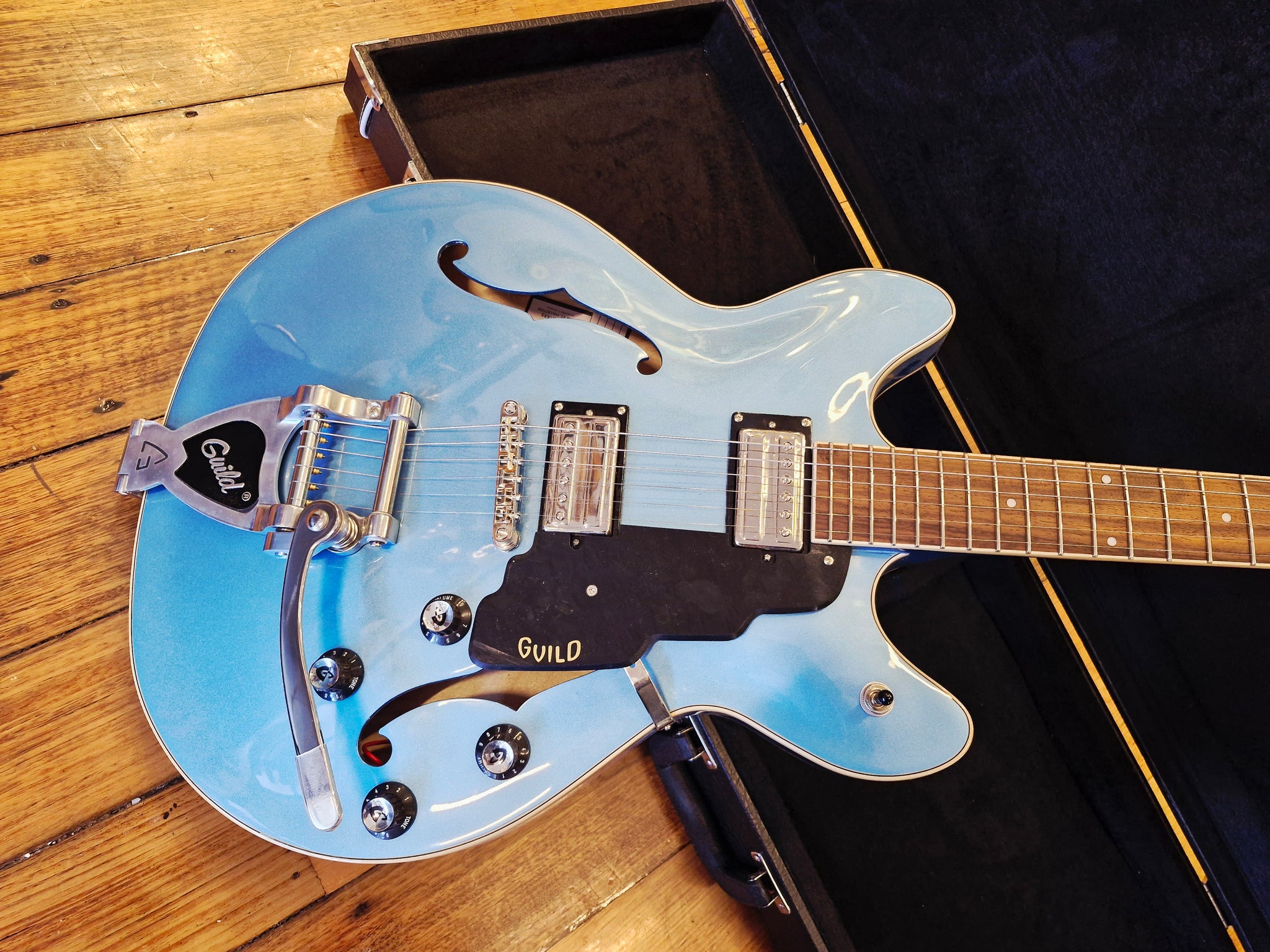 The Guild Starfire 1 DC brings legendary semi-hollow body craftsmanship to a broader audience. Its mahogany center block minimises feedback whilst preserving the articulate, resonant character semi-hollow construction is renowned for. The Pelham Blue finish showcases a hand-arched maple top, back, and sides, delivering visual distinction alongside tonal clarity. Engineered for playability, the 24¾" scale and slim neck profile facilitate rapid position shifts, whilst the 18th fret cutaway grants unobstructed access to higher registers. Guild's proprietary HB-2 Alnico II humbuckers provide vintage-voiced output with push-pull coil-splitting capability, enabling versatile single-coil textures when needed. Precision tuning is maintained through premium 18:1 ratio tuners and a Tune-o-matic bridge, whilst the vibrato tailpiece with roller tension bar expands sonic possibilities.