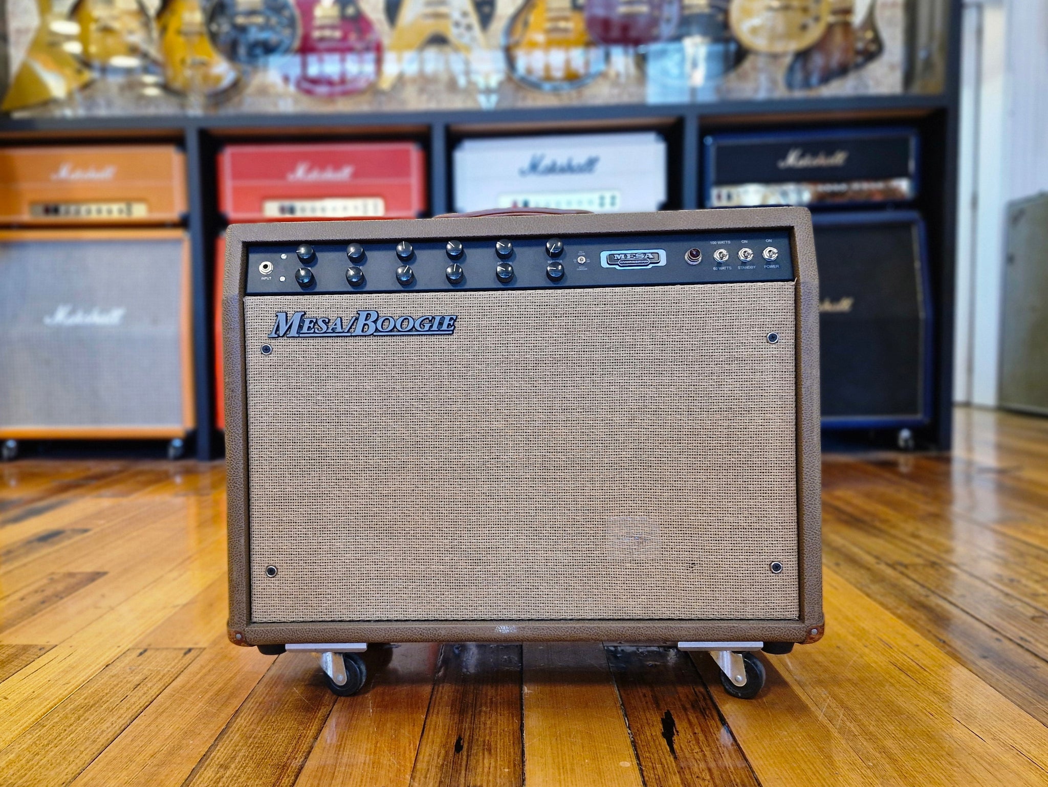 The Mesa/Boogie F-100 combo amplifier delivers 100 watts of Class A/B power ensuring a rich and dynamic tone. It features a half-power switch for flexible volume control, fixed bias circuitry for consistent performance, and two fully independent channels each with dedicated gain. Mounted on wheels for easy mobility, this combo amp offers exceptional sound quality in excellent condition.