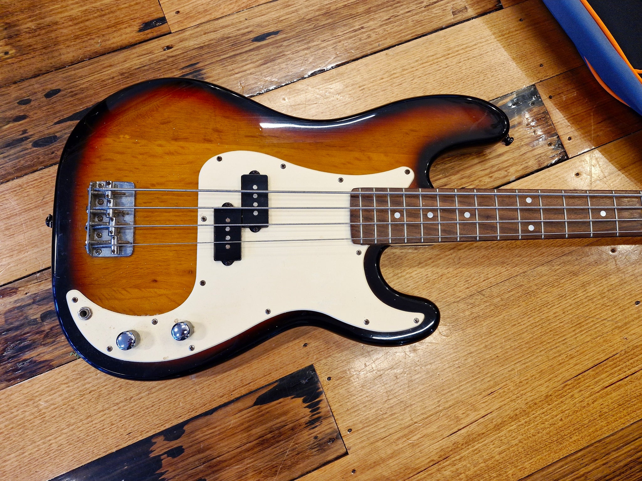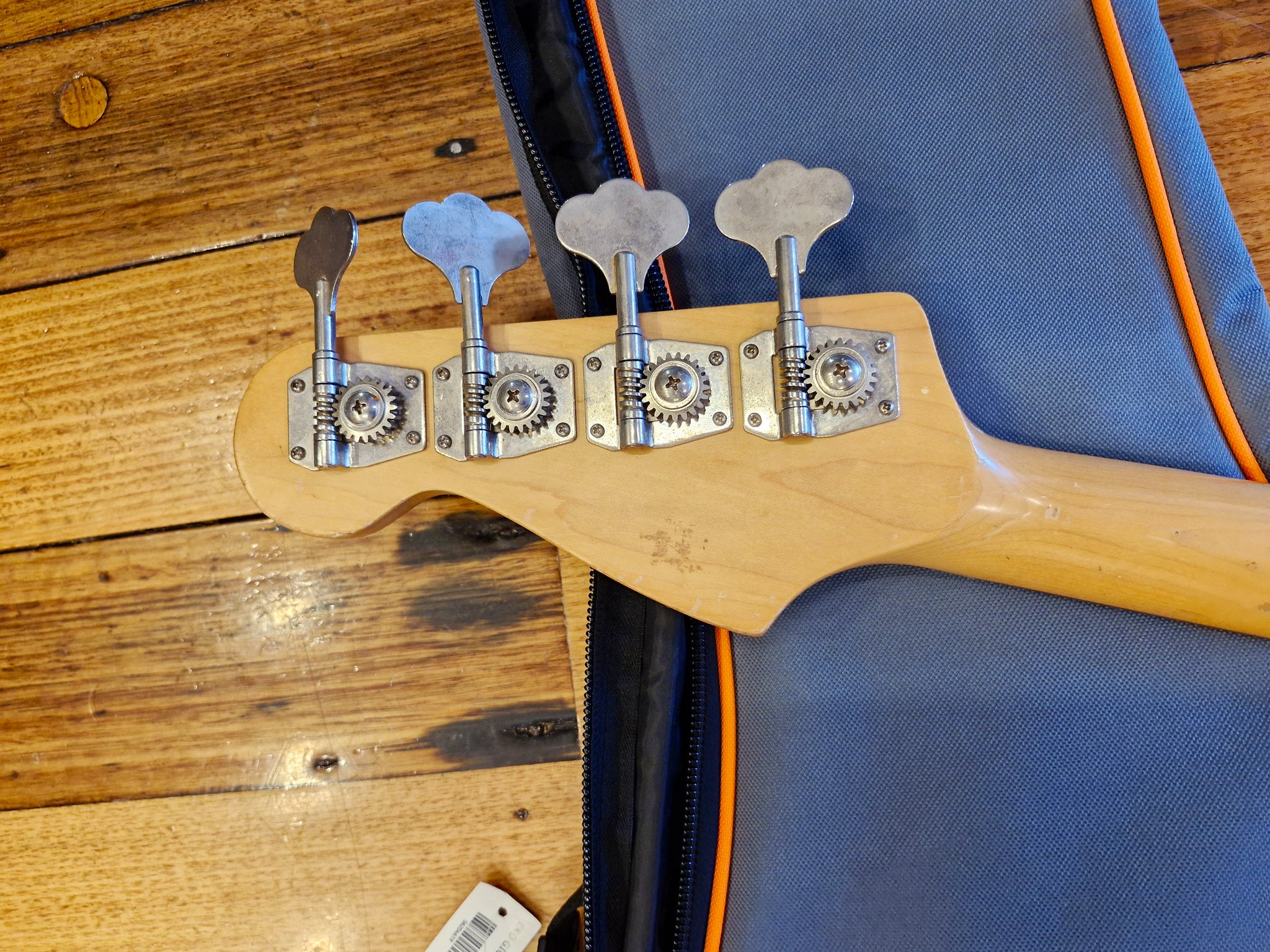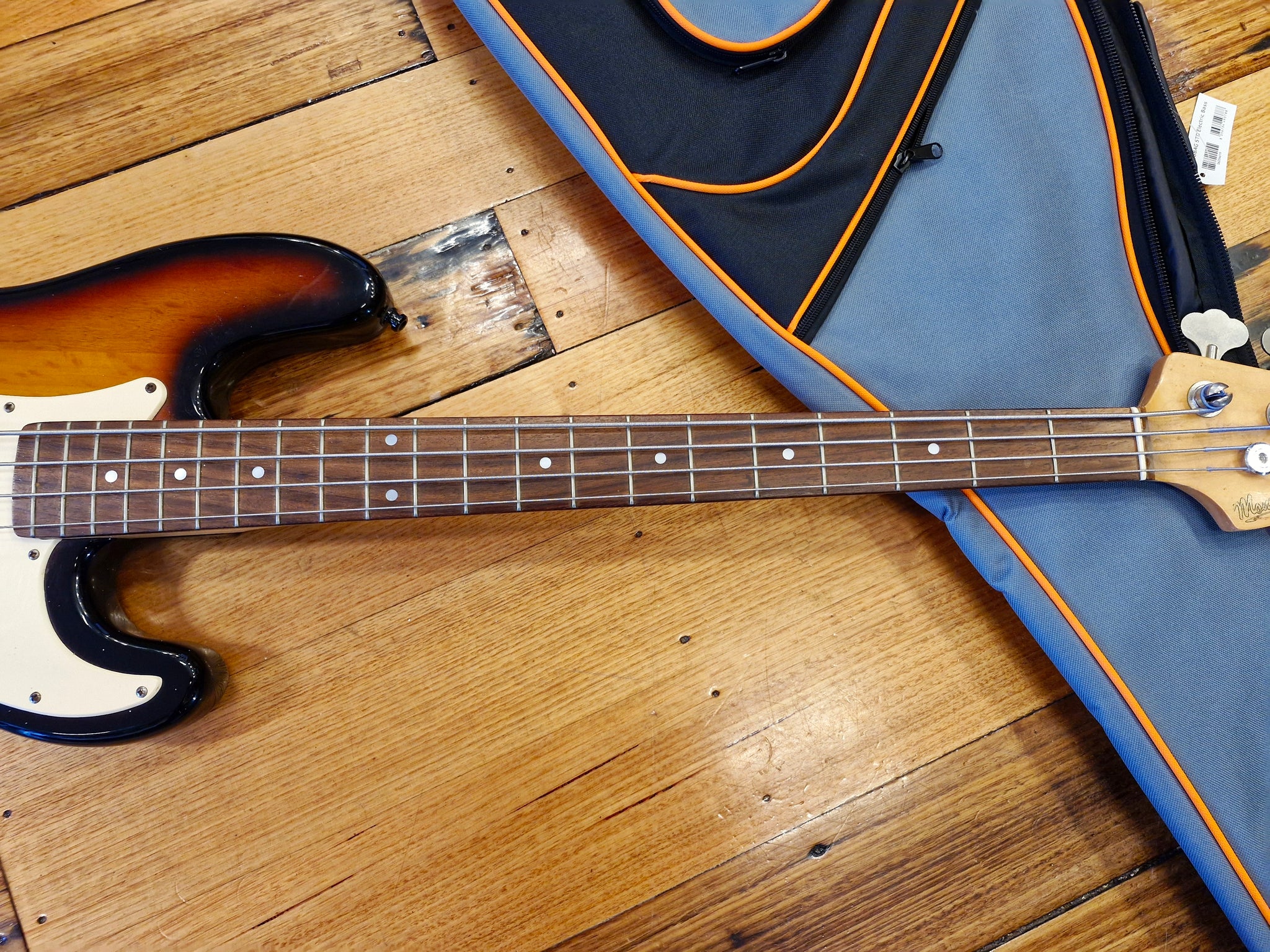 Ideal for beginning bass players seeking an instrument with character and proven durability. This well-played model bears minor cosmetic wear—light scratches along the neck and a small body chip—that attest to its road-tested construction without compromising performance or playability. Includes a protective gig bag for transport and storage.