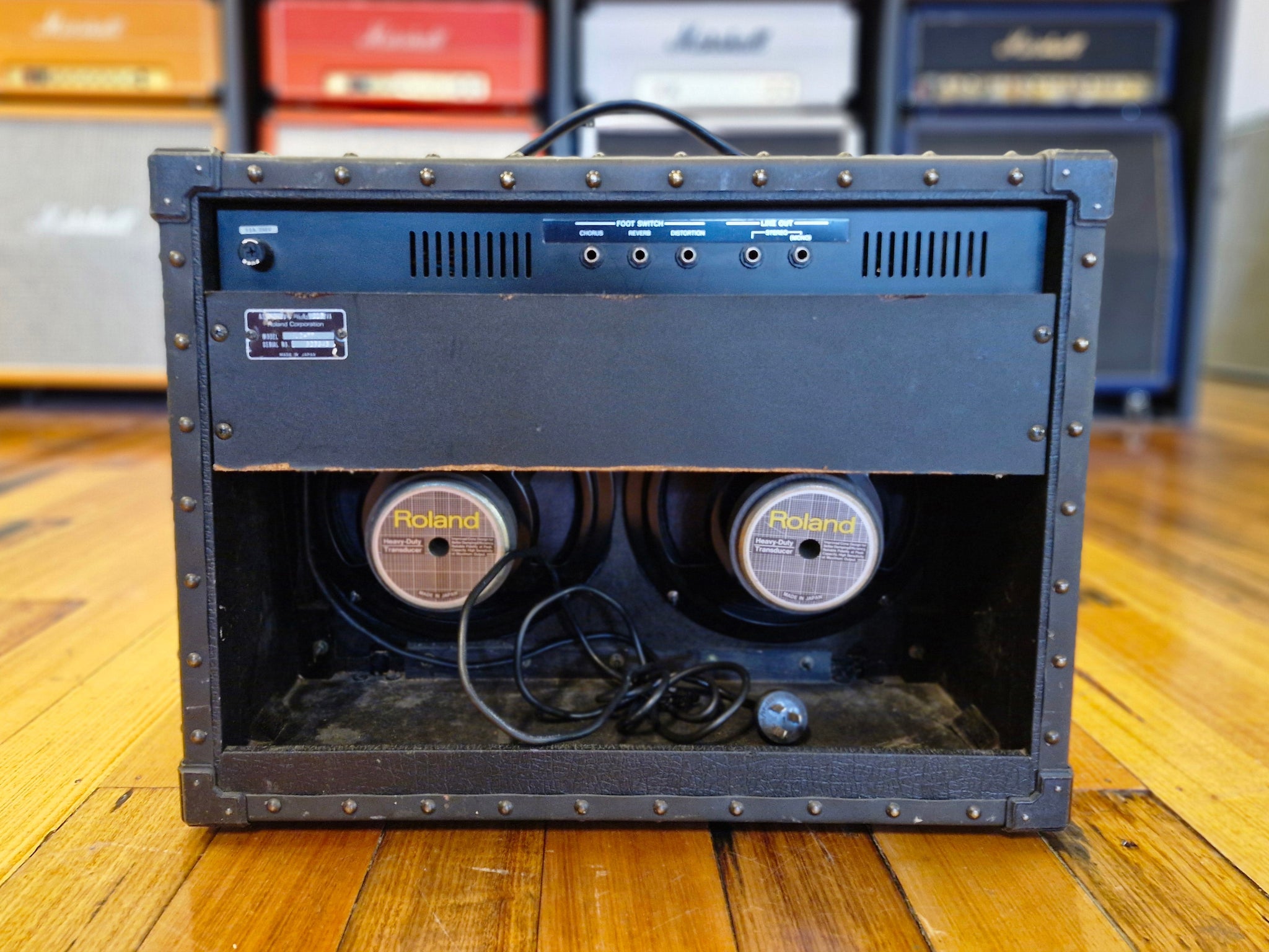 The Roland JC-77 is a solid-state 80-watt guitar combo amplifier from the iconic Jazz Chorus series, featuring dual 10-inch speakers that deliver a broad, clear soundstage. It offers the renowned "JC Clean" tone enhanced by built-in stereo chorus, reverb, and a distortion channel, making it suitable for a wide range of styles including jazz, rock, and new wave. This model is a more portable alternative to the larger JC-120, ideal for both live performances and studio work. With its distinctive character look and good condition, the JC-77 remains a versatile and reliable amp choice.
