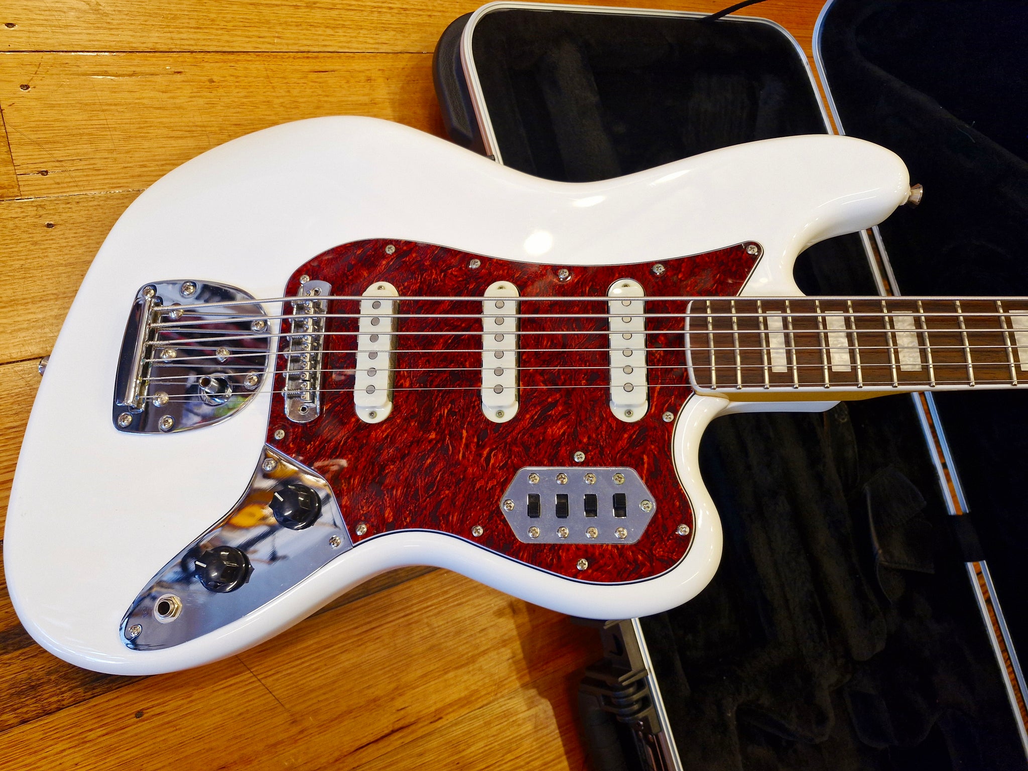 The Squire Bass VI delivers authentic vintage character for musicians ready to venture beyond conventional territory. Pitched an octave below standard guitar tuning and equipped with a vintage-style tremolo system, this instrument opens creative possibilities for both guitarists and bassists seeking sonic exploration. The slim "C"-shaped neck and 9.5"-radius fingerboard with narrow-tall frets ensure comfortable playability, while the floating bridge with barrel saddles maintains reliable intonation stability. Authentic period details include 1960s-inspired headstock graphics, nickel-plated hardware, and a vintage-tint gloss neck finish that captures the aesthetic of the original 1961–1975 era. Built with a poplar body, maple neck, and three Fender-designed Alnico single-coil pickups, this 30"-scale instrument combines historical accuracy with modern player-friendly construction.