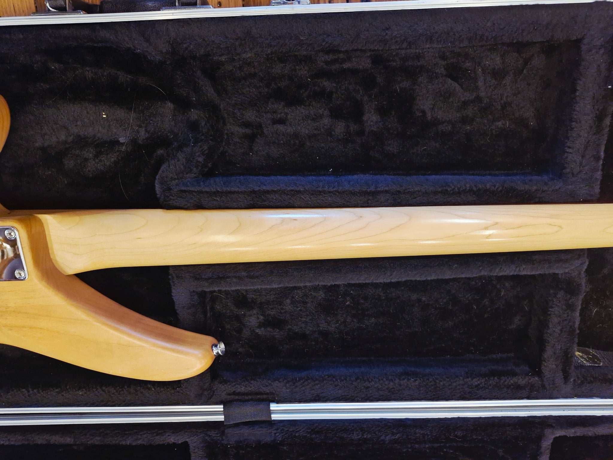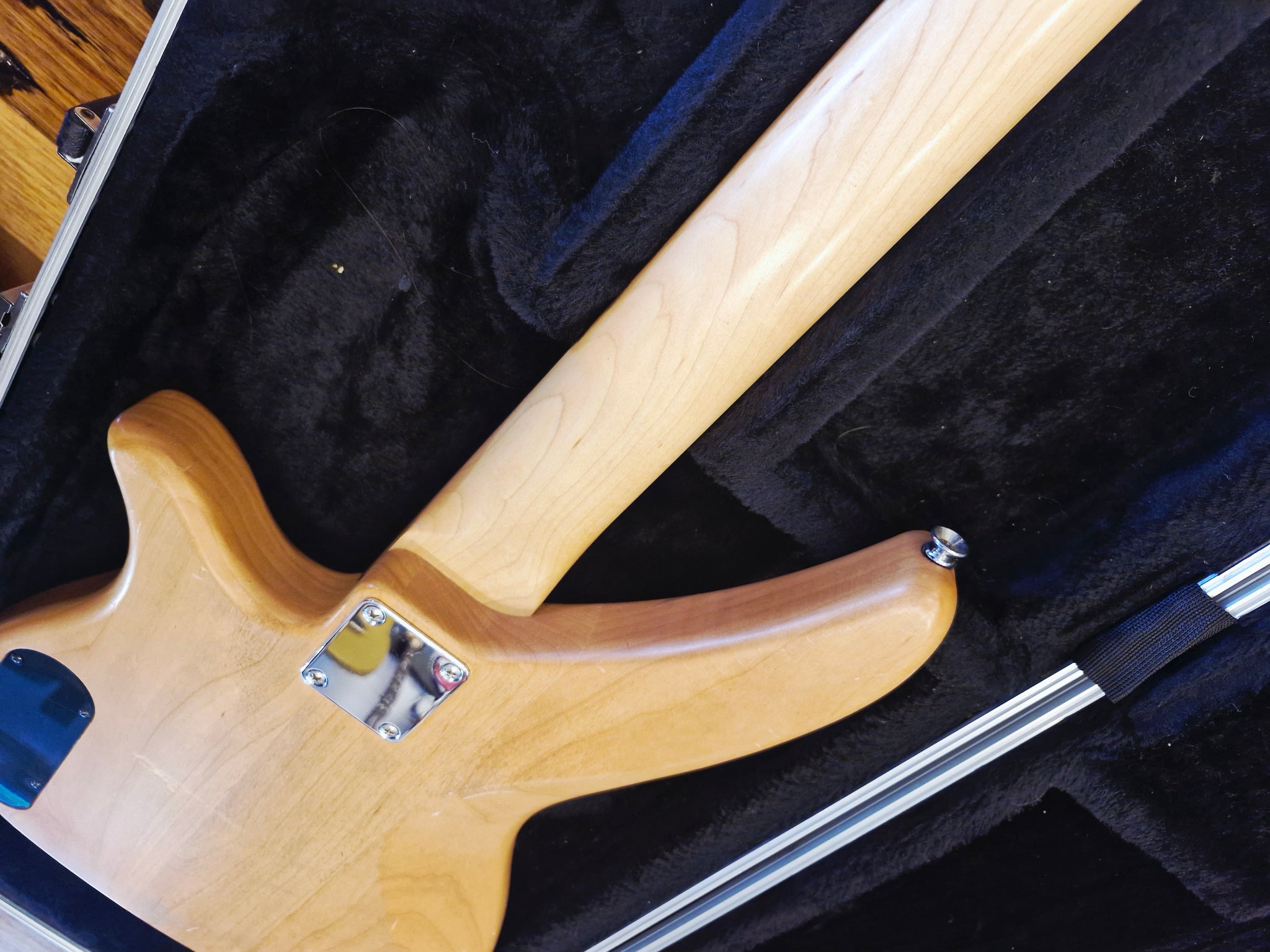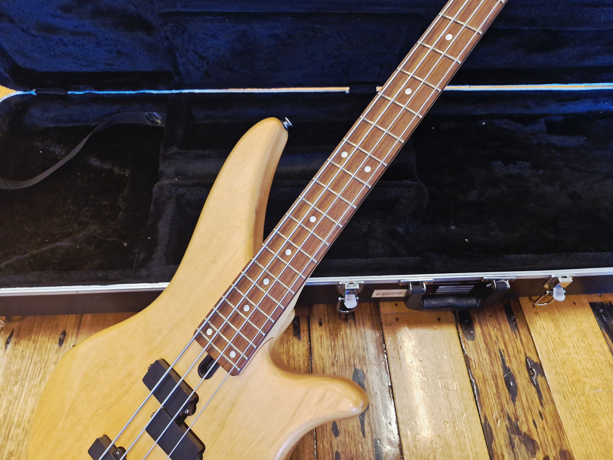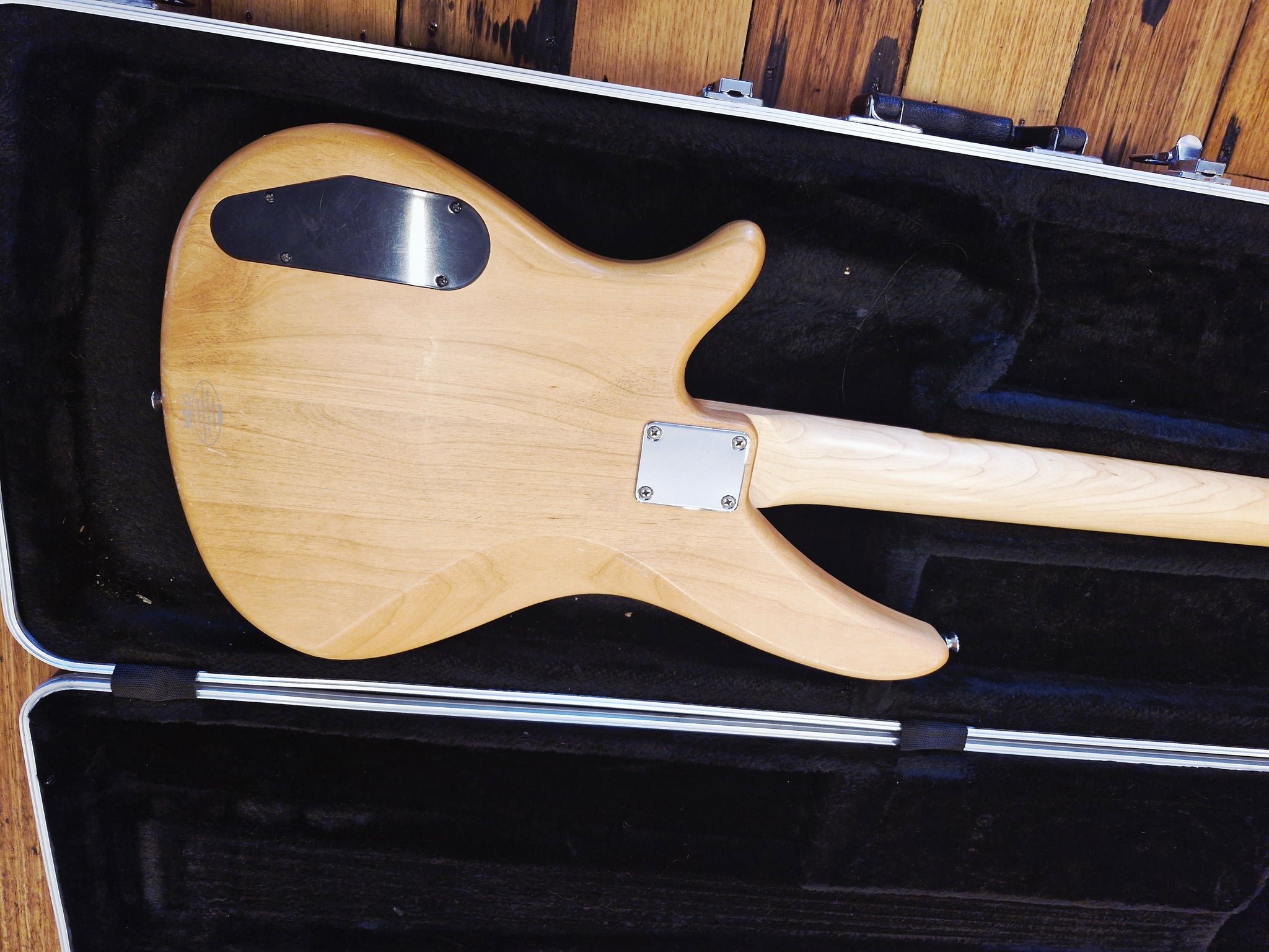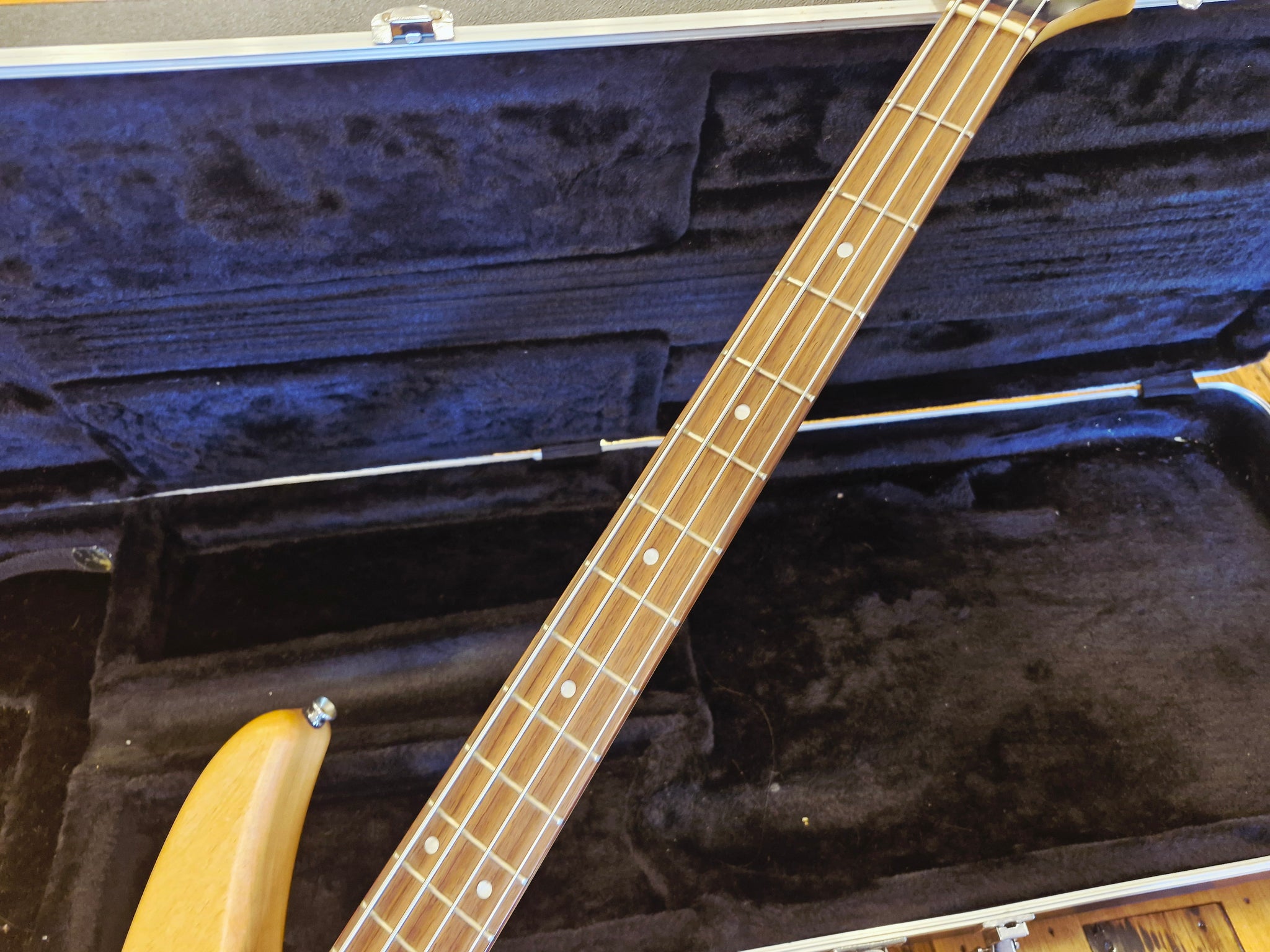 The Yamaha RBX270 Bass Guitar offers distinctive tonal character and high-quality sound. Its lightweight, sleek design allows for easy transportation, and while there are minor dings and scratches on the body, these do not impact its performance. Fitted with flat wound strings, it delivers smooth playability and a comfortable playing experience.